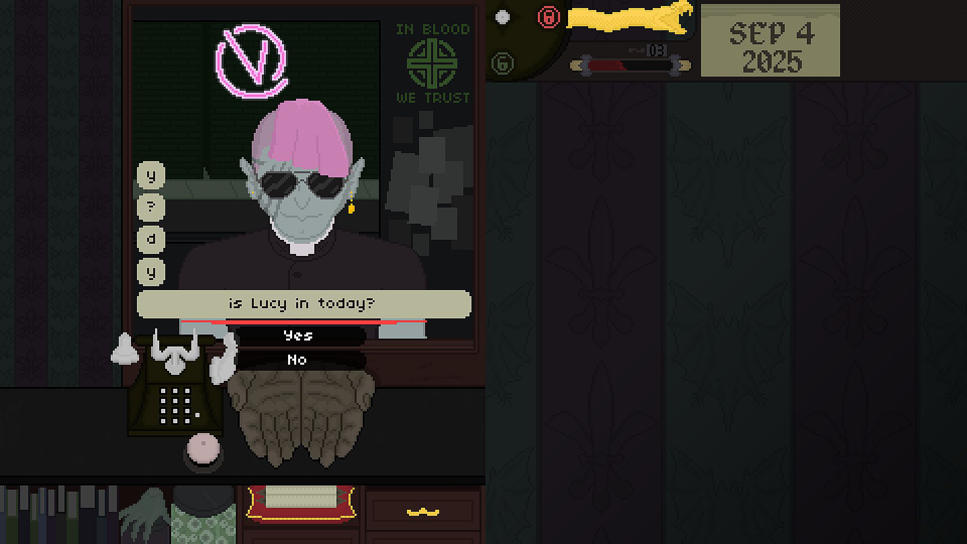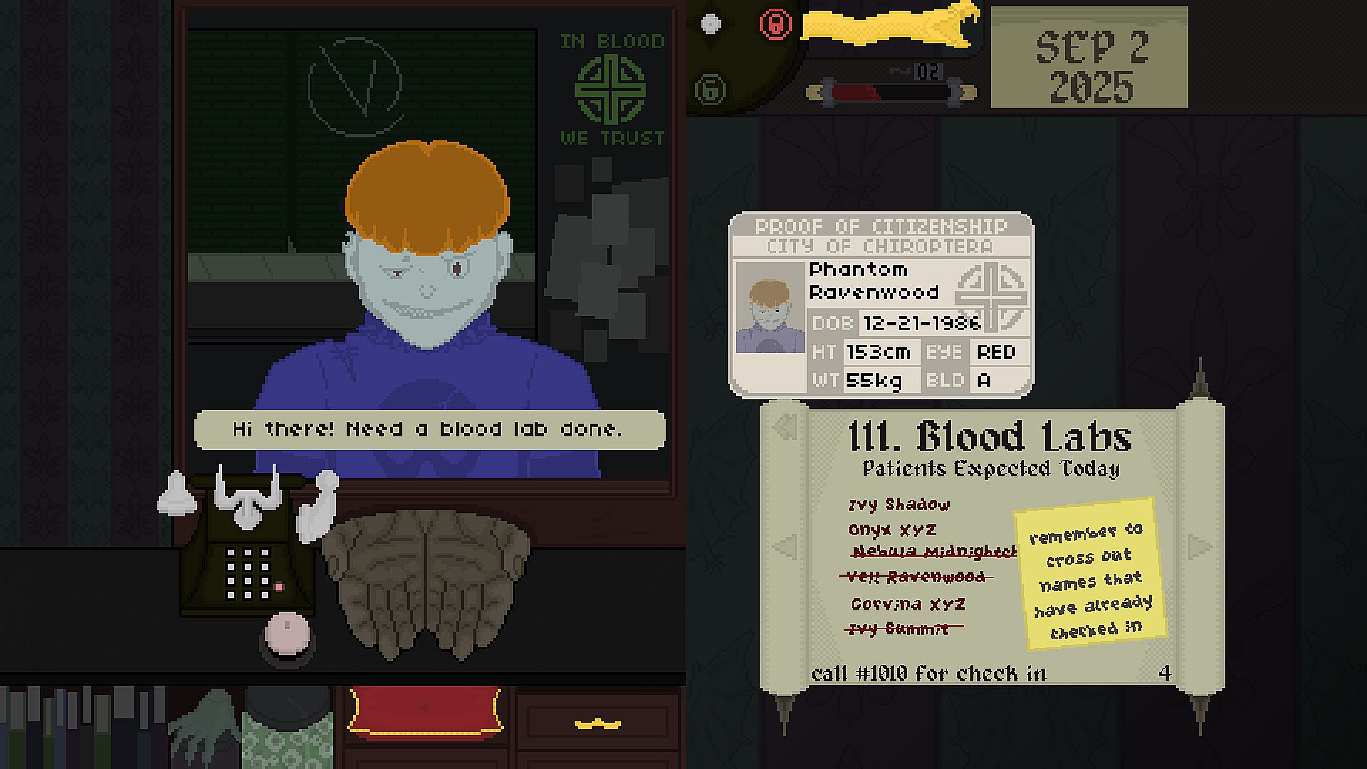 They Came for Blood is a desk simulation game. Your goal is to make it through the month and make enough income to afford rent in your apartment. Greet donors at the blood bank, look at their ID to determine if they're good to donate blood, and either let them inside, or reject them for not meeting the requirements. Sometimes vampires try to slip in, which can spell disaster for the hospital staff. Let in too many vampires, and the staff will be picked off one by one until you're the only one left to suck dry.