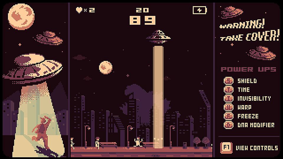 Press LEFT mouse button to use the abduction beam and change the direction that your UFO is moving. When UFO reaches the end of the screen, he will turn around, changing direction. Your ship have also the WARP drive (super fast move), just press the RIGHT mouse button.