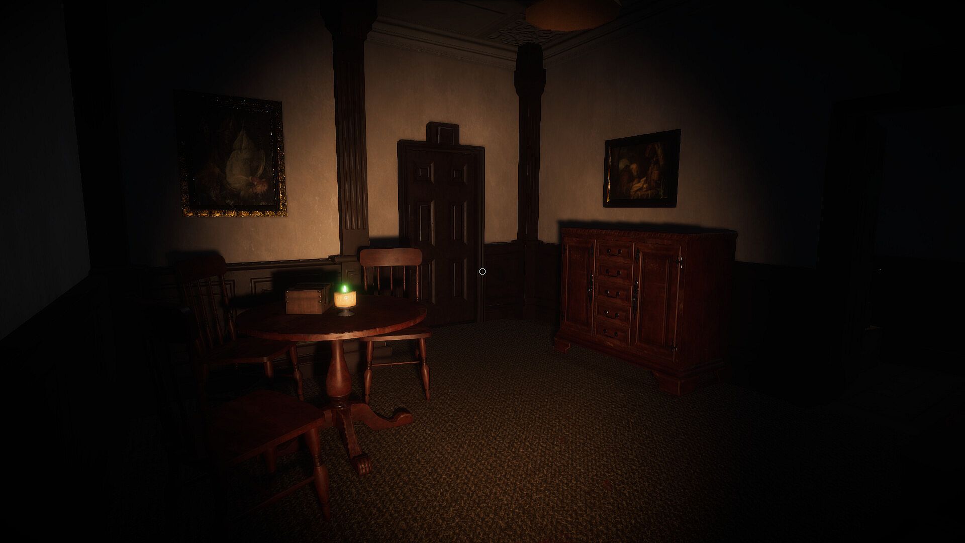 In Nightmare Mode, escape a procedurally generated manor. Find evidence and other useful items to help you escape while avoiding the horrors within.