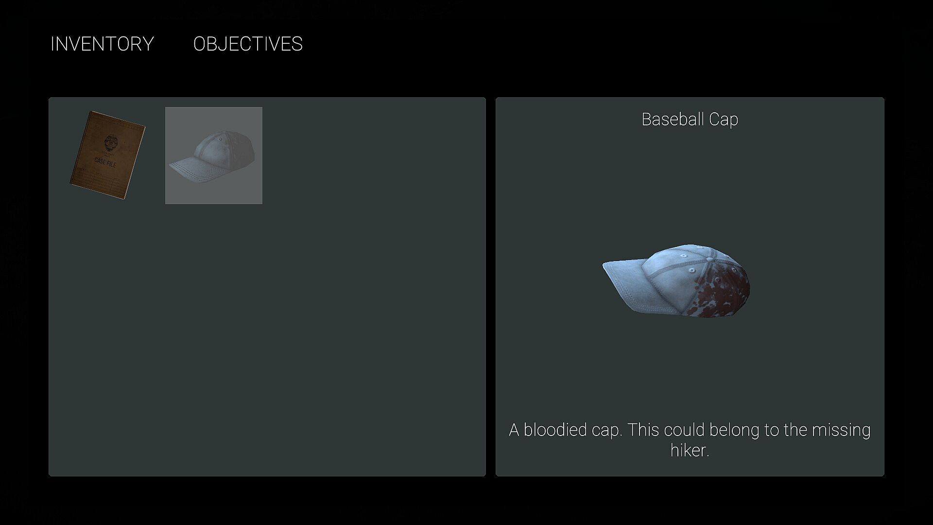 Discover items along the trail and pick them up. Inspect them to help uncover what happened to the missing hiker, and gather any clues as to their whereabouts.