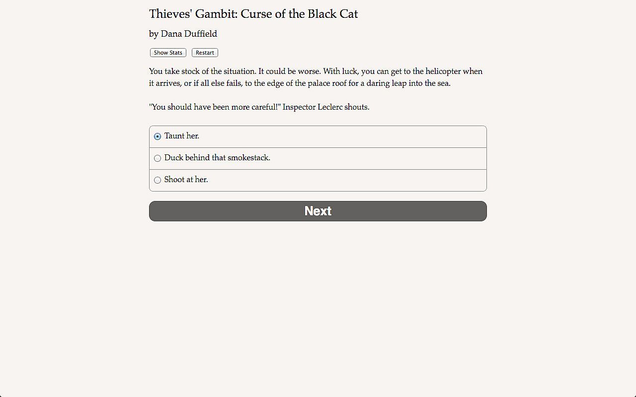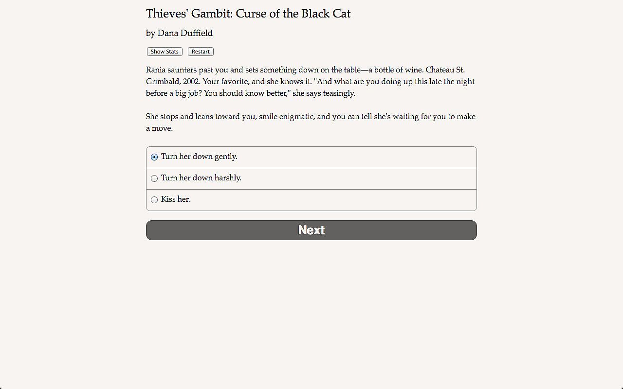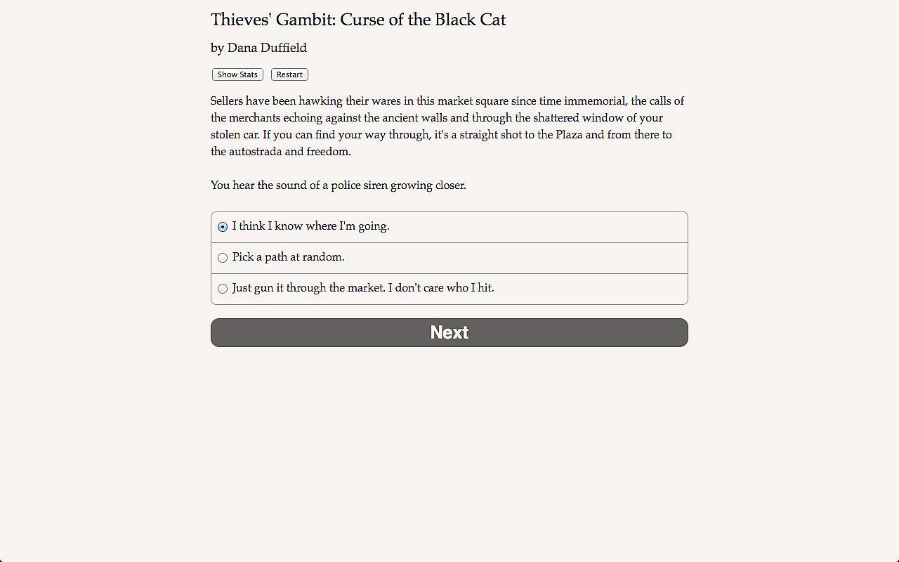 “Thieves’ Gambit: The Curse of the Black Cat” is an interactive heist caper by Dana Duffield, where your choices control the story. It's entirely text-based--without graphics or sound effects--and fueled by the vast, unstoppable power of your imagination.