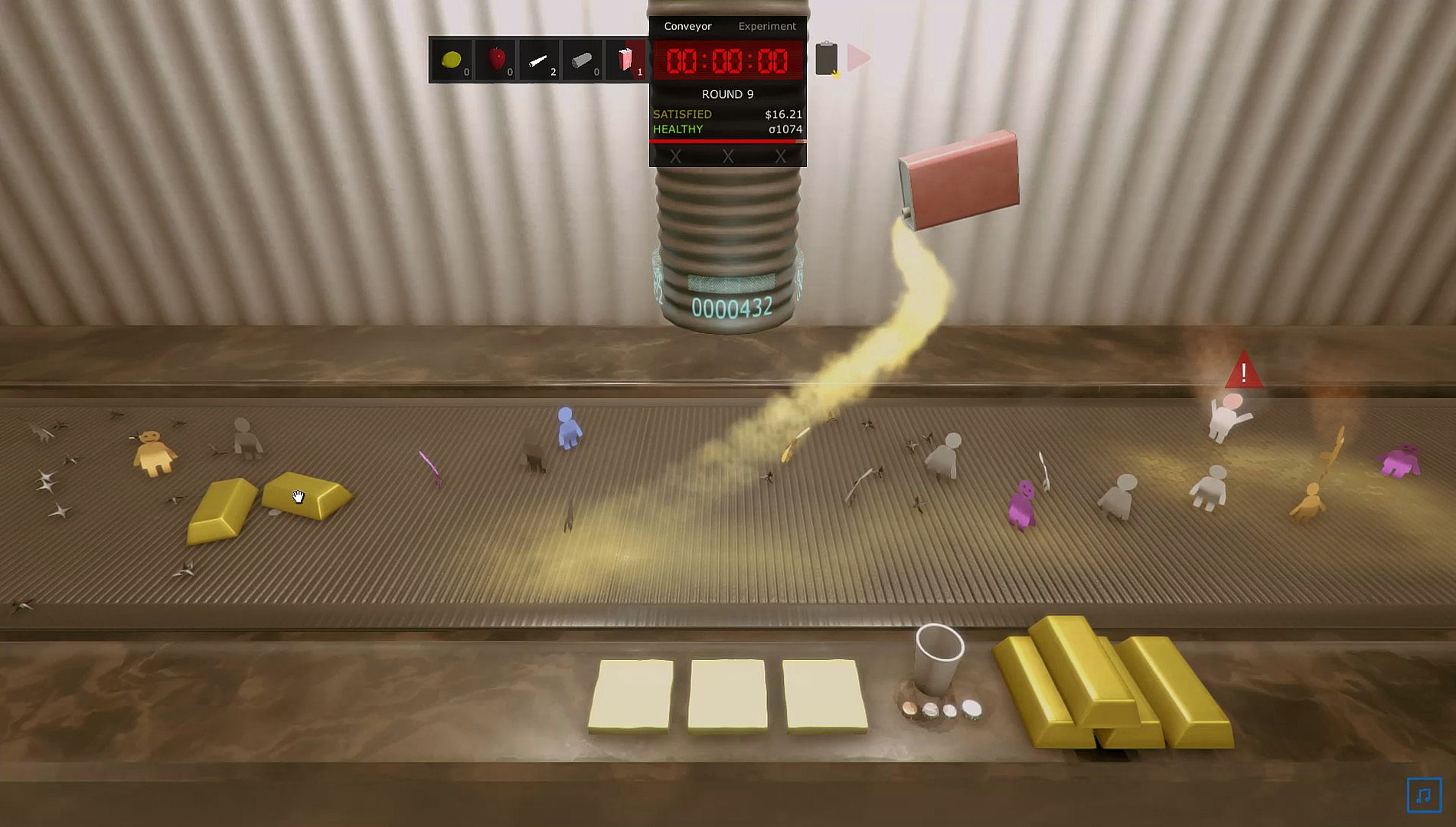 Face a chaotic conveyor belt loaded with spare change, clean food, gold bars, and explosive paper people. Collect coins or tube paper beings with distinct social statuses and genders-over 50 types trigger text events based on group balance, while malicious ones threaten stability. Grab food like apples and lemons to eat, snag medical marijuana to slow time, apply bandages, or unleash gasoline to ignite the belt; dodge caltrops to avoid injury, and never let gold melt in the furnace or face dismissal. Stockpile paper people for three experiment mini-games: race one in Ground Race by jumping obstacles, knock climbers off walls except golden ones in Rock Climbing, or manage overheating tubes as Operator. Button mashing drives the action, so tough fingers help. Casual indie players who relish quick prejudice calls and absurd factory mayhem will keep coming back.