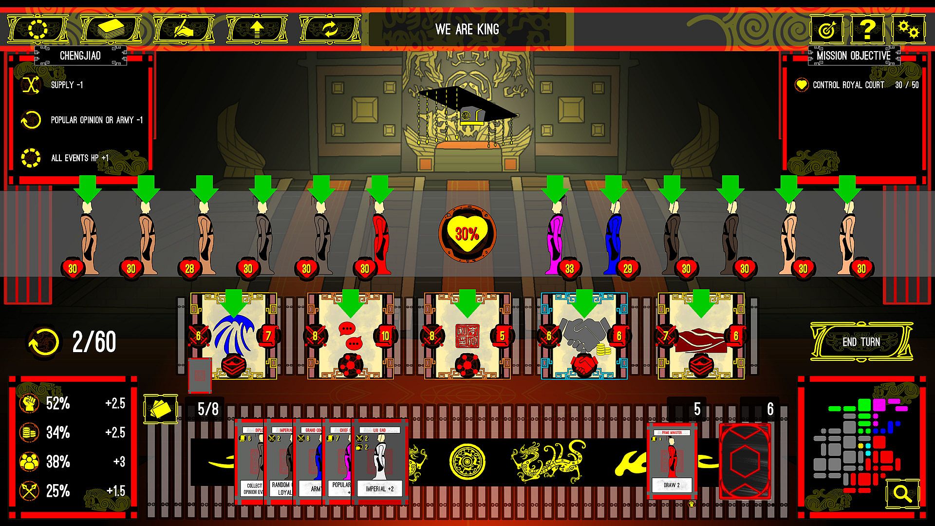 - Events: Each events card will bring some negative effect, use your follower or royal court member to solve those problems
