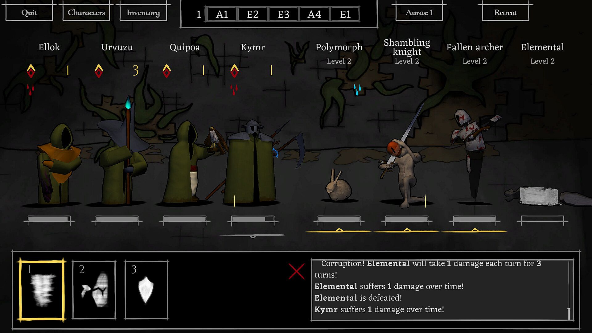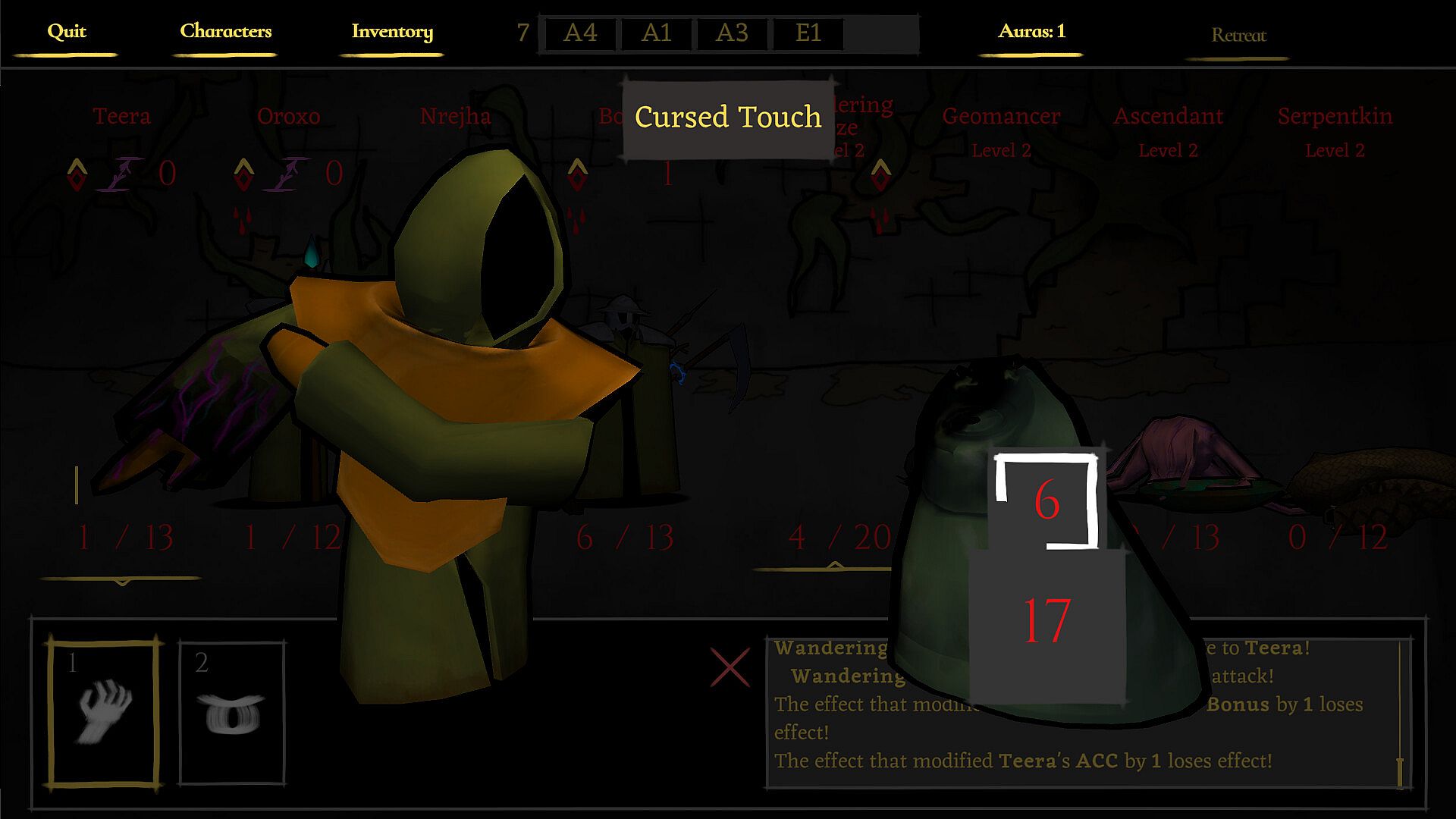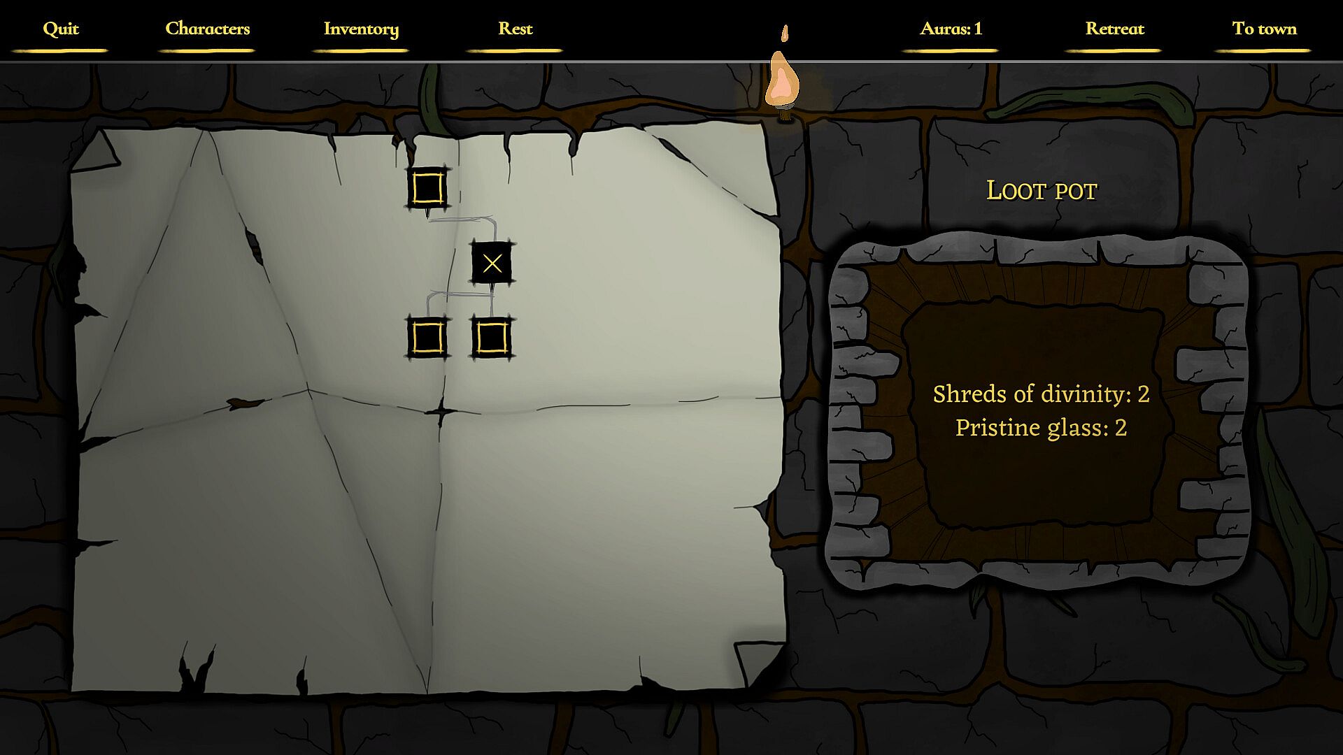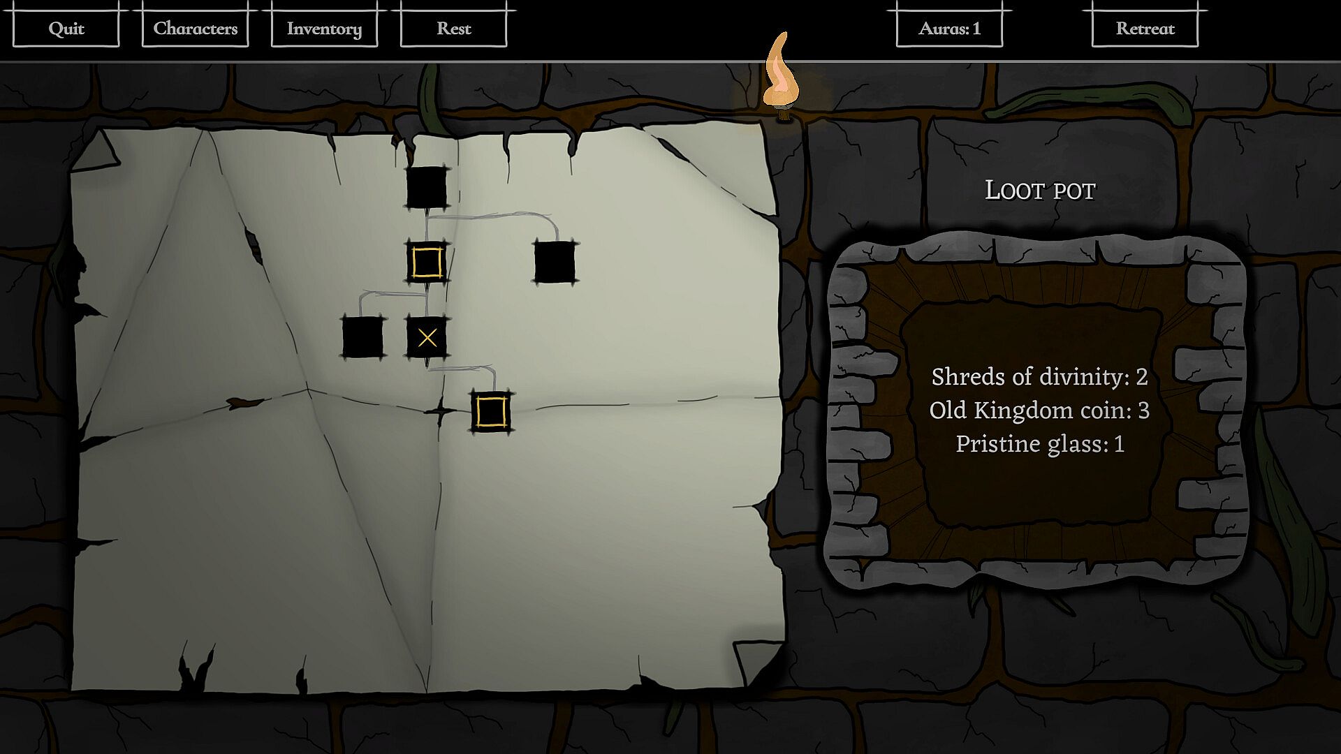 Items are scarce, yet essential. Provisions help with surviving the harsh environments and recovering from combat. Natural resources allow the adventurers to create more provisions or upgrade equipment. Mindful usage and observant exploration are key.