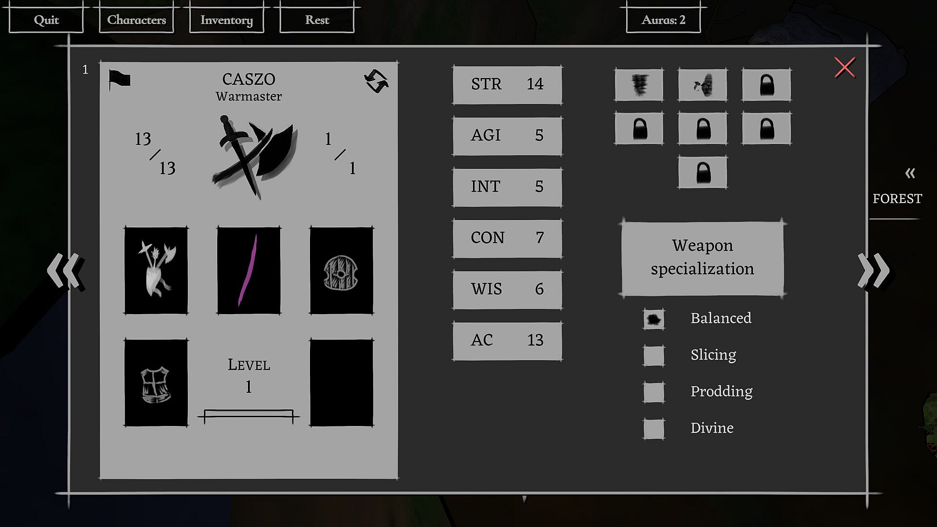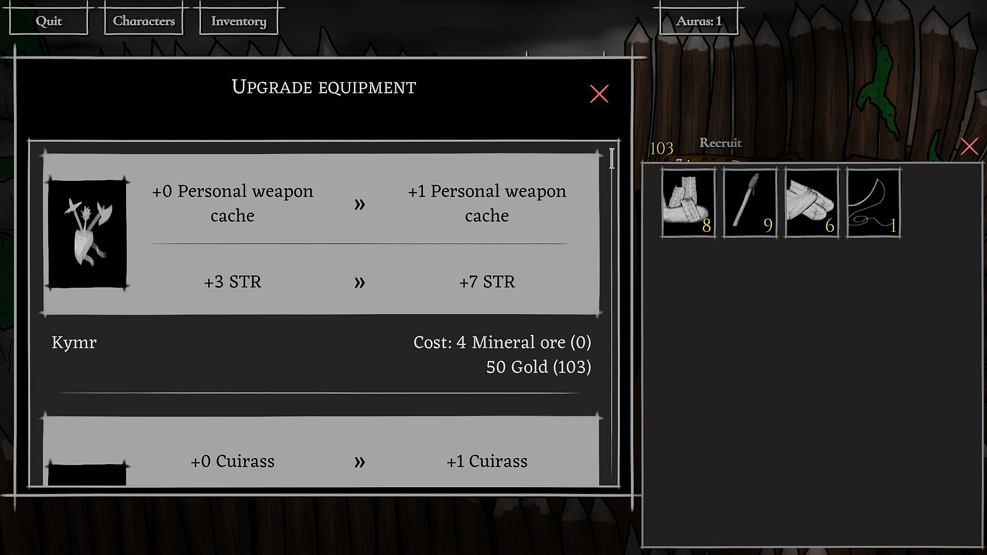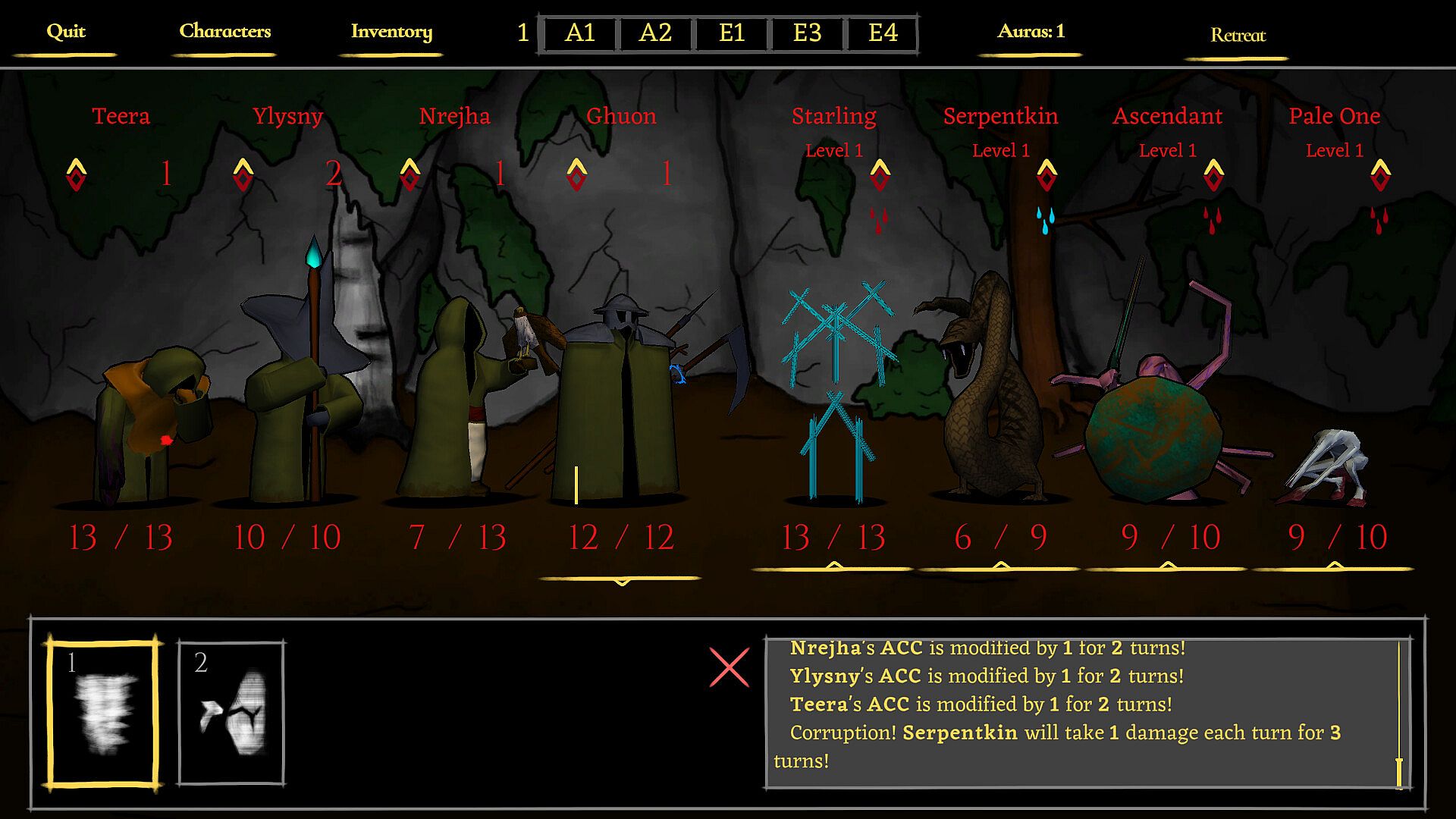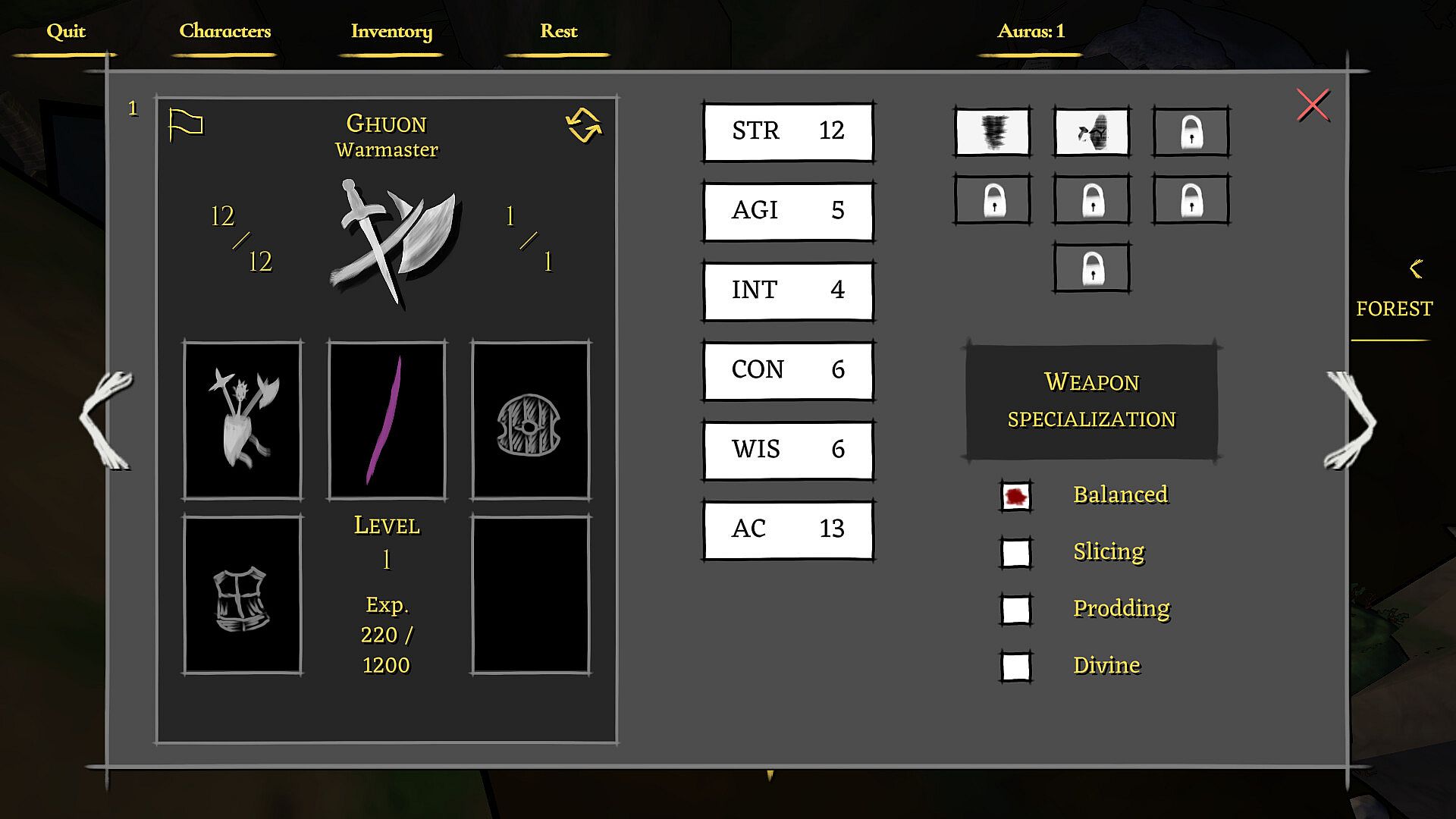 Items are scarce, yet essential. Provisions help with surviving the harsh environments and recovering from combat. Natural resources allow the adventurers to create more provisions or upgrade equipment. Mindful usage and observant exploration are key.