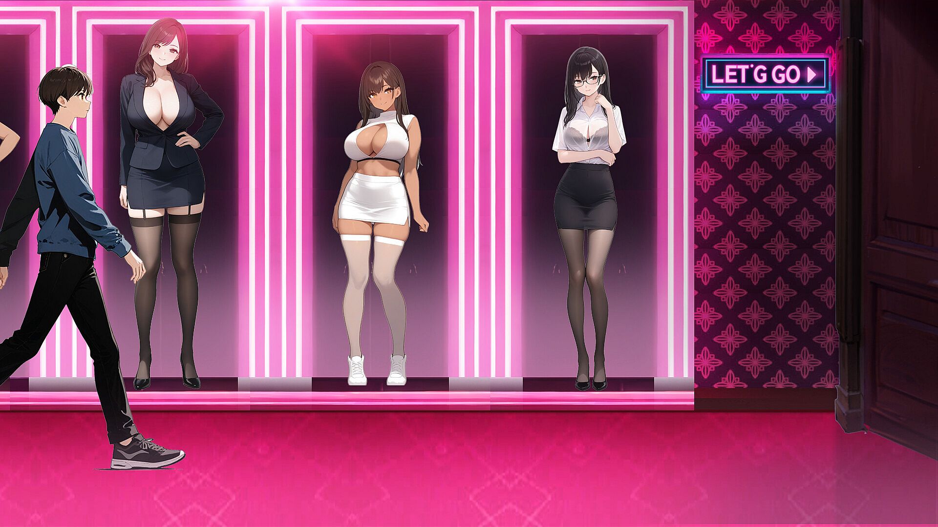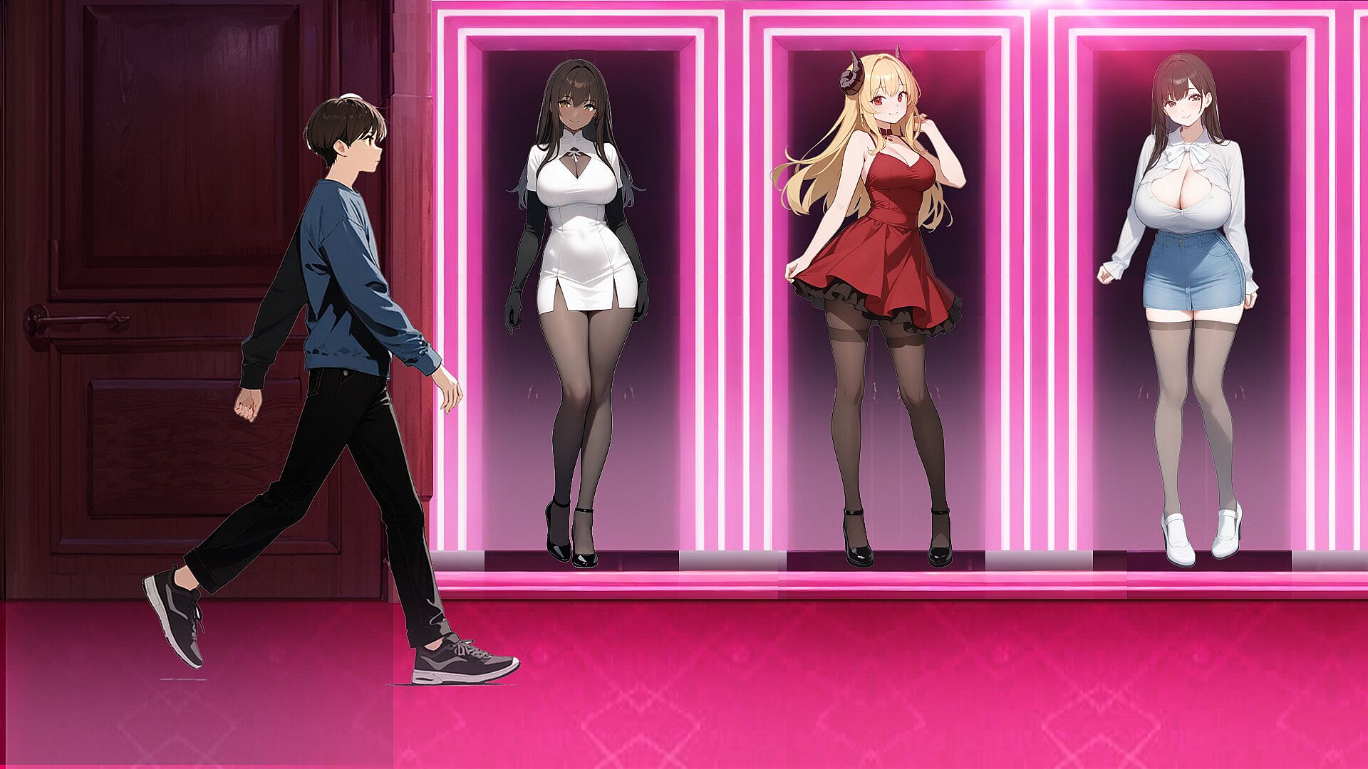 Bright, stimulating lights dazzle the protagonist's eyes, and beautiful women tempt him.