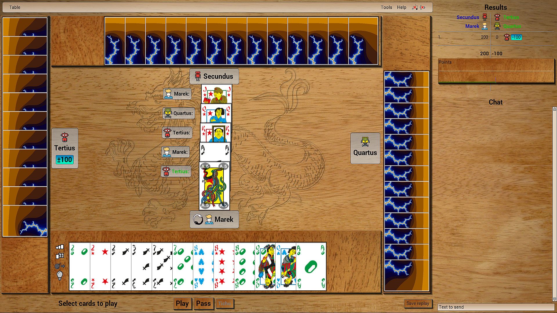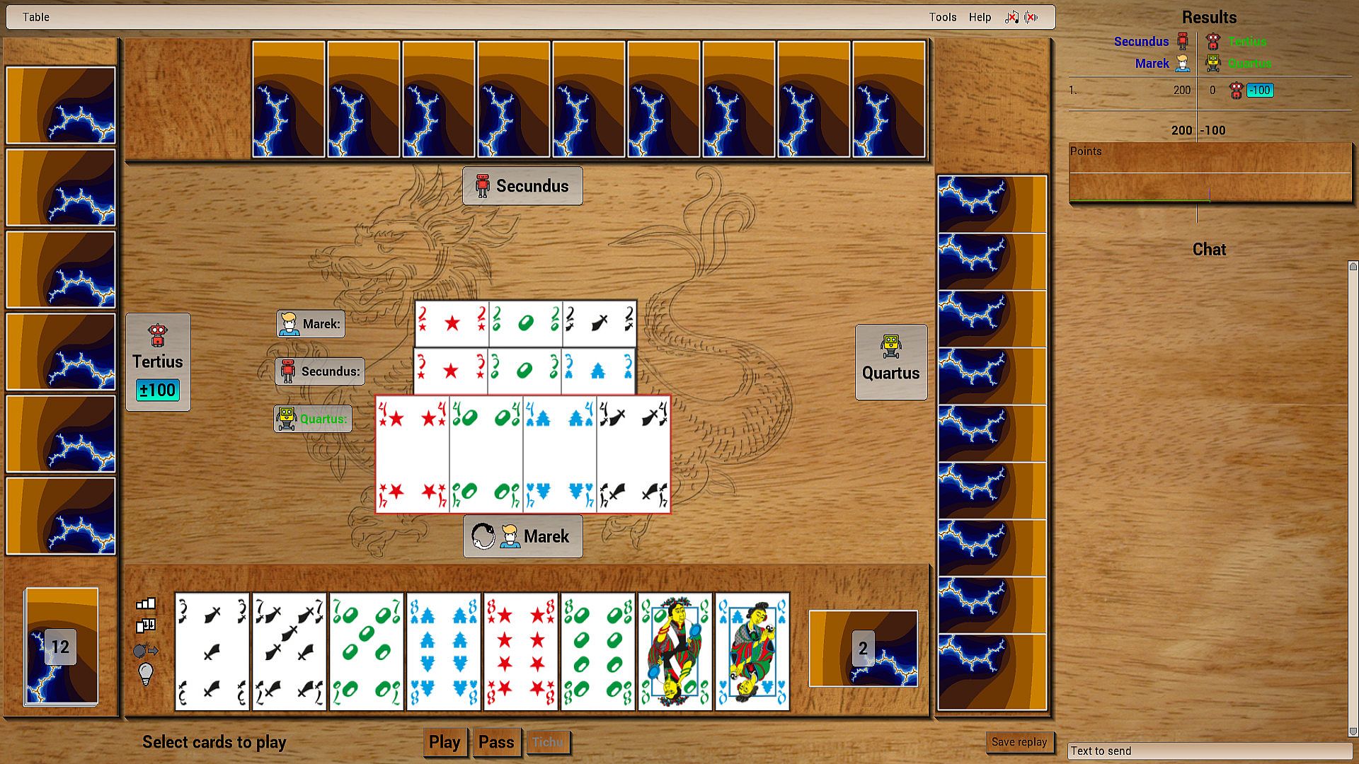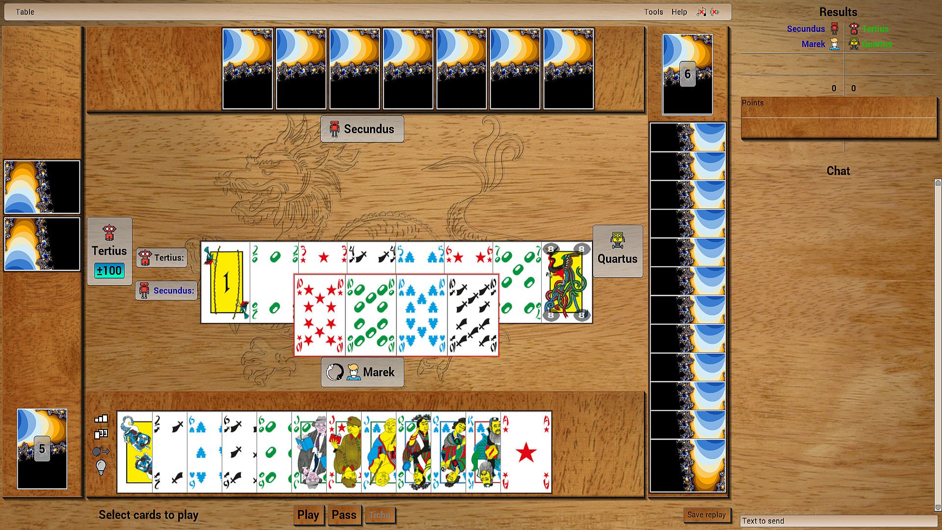 Play with bots to polish your form, and then get a group of friends and show them who's boss. In tichu only 4 players are admissible, 2 vs 2, partners sit in front of each other.