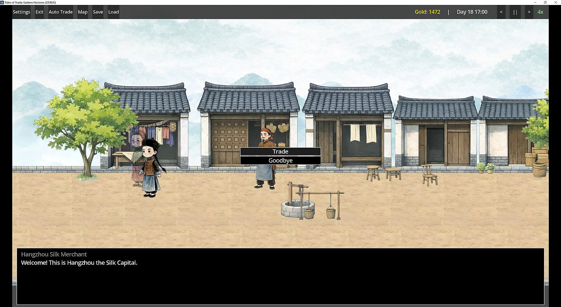 This game is a 2D merchant trading game. You will travel between different cities, exploring streets and ports to meet and interact with NPCs such as merchants and boatmen, trading goods by taking advantage of regional price differences—buy low and sell high—to steadily build your wealth and plan more efficient trade routes. The game also features a quest system: complete various commissions and objectives to earn item rewards and drive your growth as a trader.