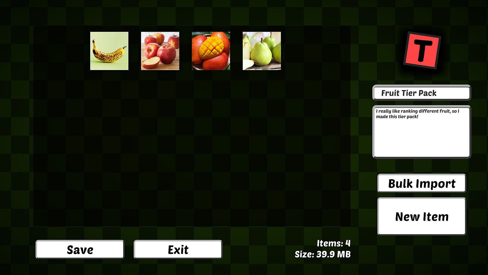 Can't find what you're looking for? Tier It Together! also features a built-in tier pack creator with support for bulk importing of text and images to ensure you can set-up your tier list as quickly as possible.