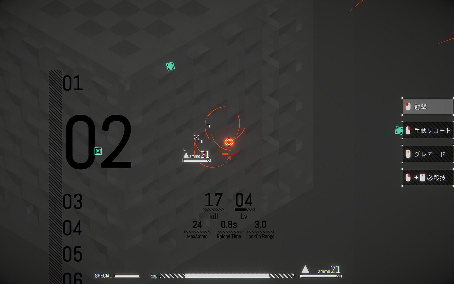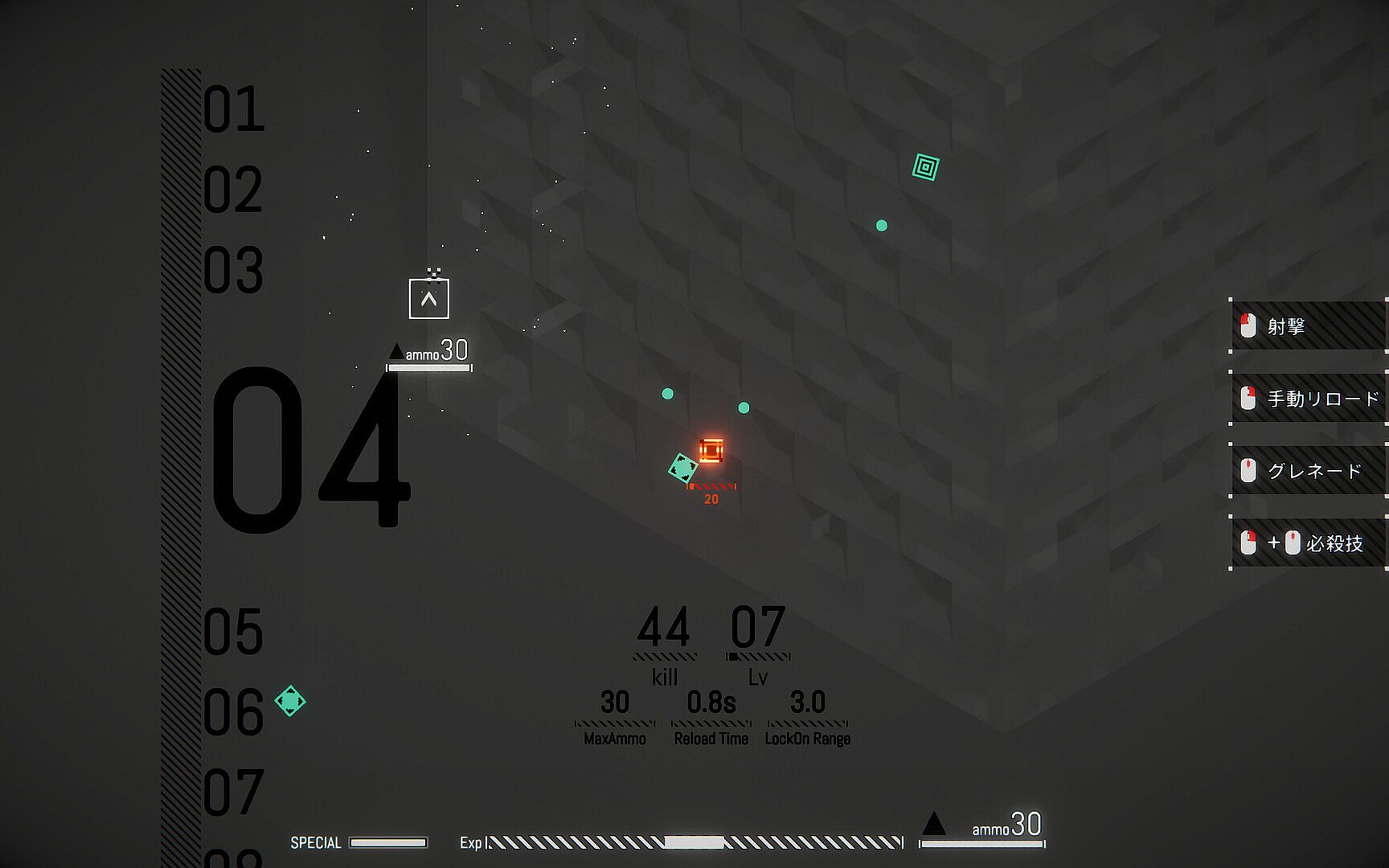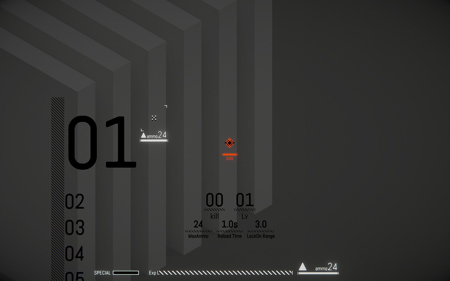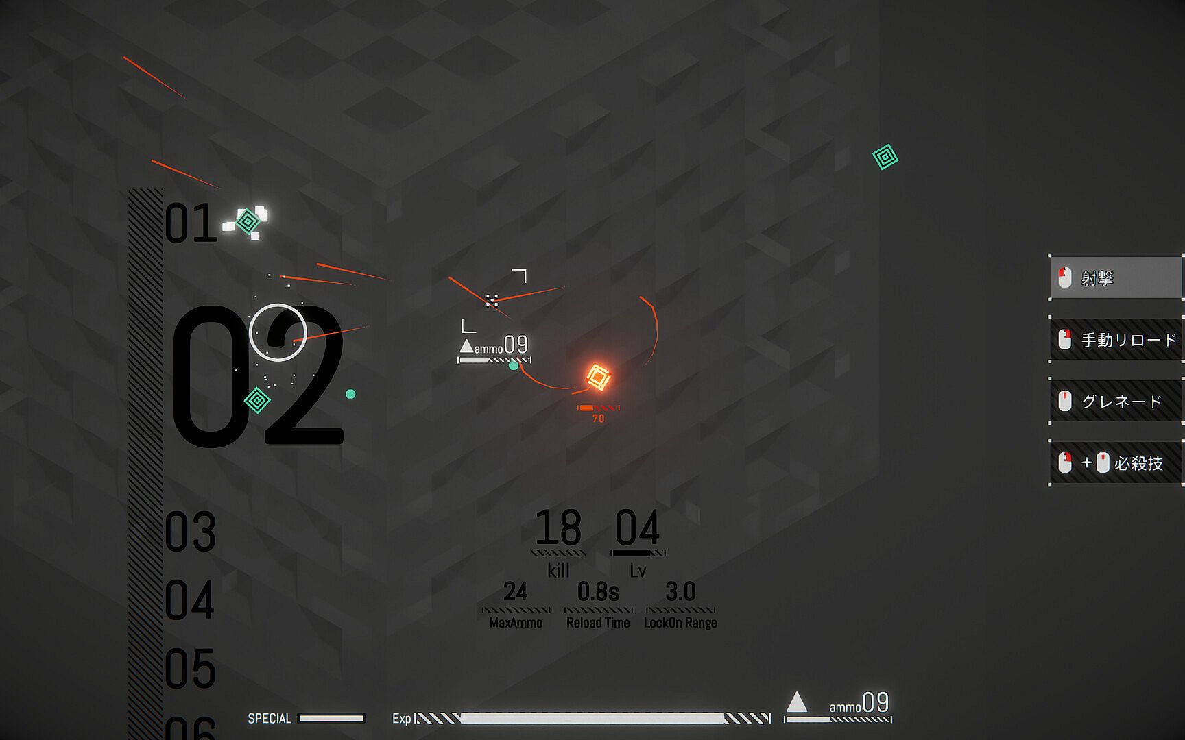 This is a 2D reaction-based shooter where you intercept enemy bullets approaching from the front and push through the waves.