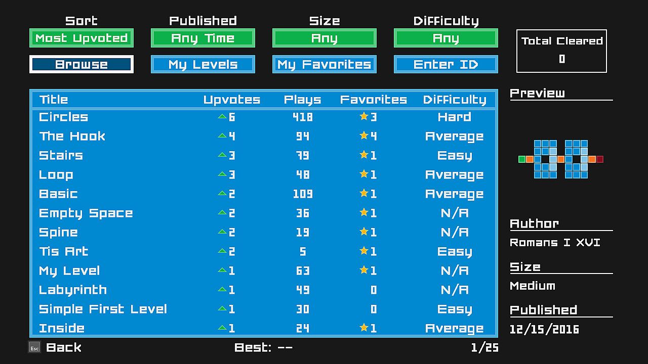 This is where things get really fun, you can publish your creations and share them with the world! Every player created level has the ability for players to upvote, favorite, and rate the difficulty of the level.