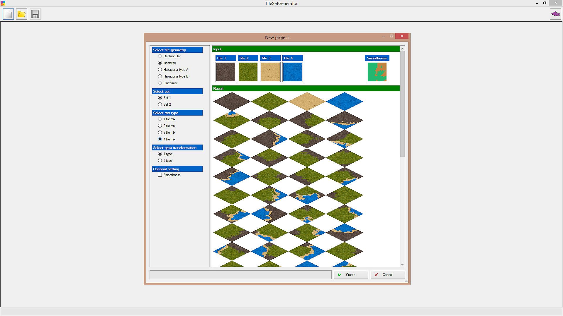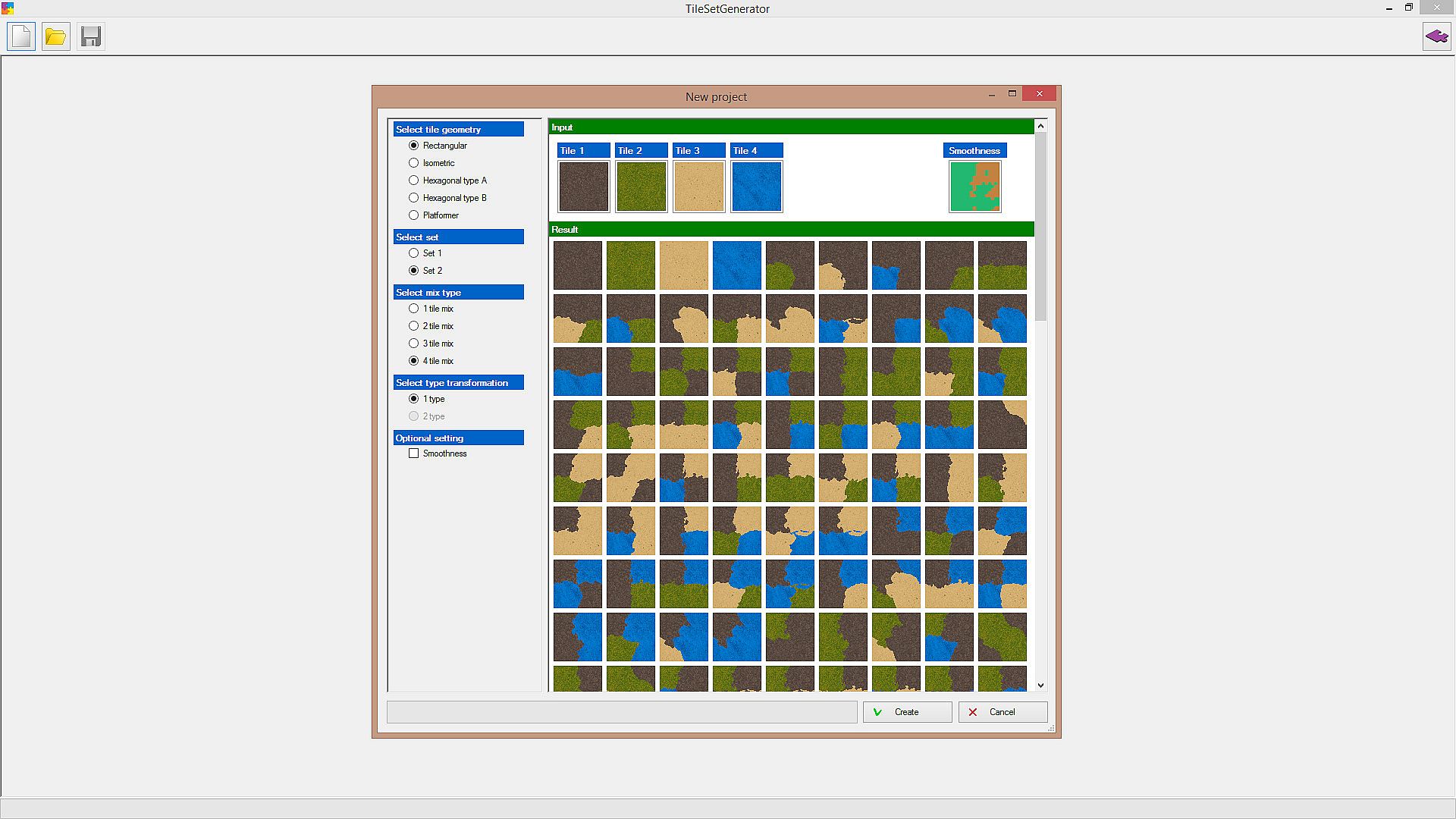 The program generates tiles from textures (by means of the built-in masks). You can select how many textures will be mixed (1-4). And of course you can select any textures you want.