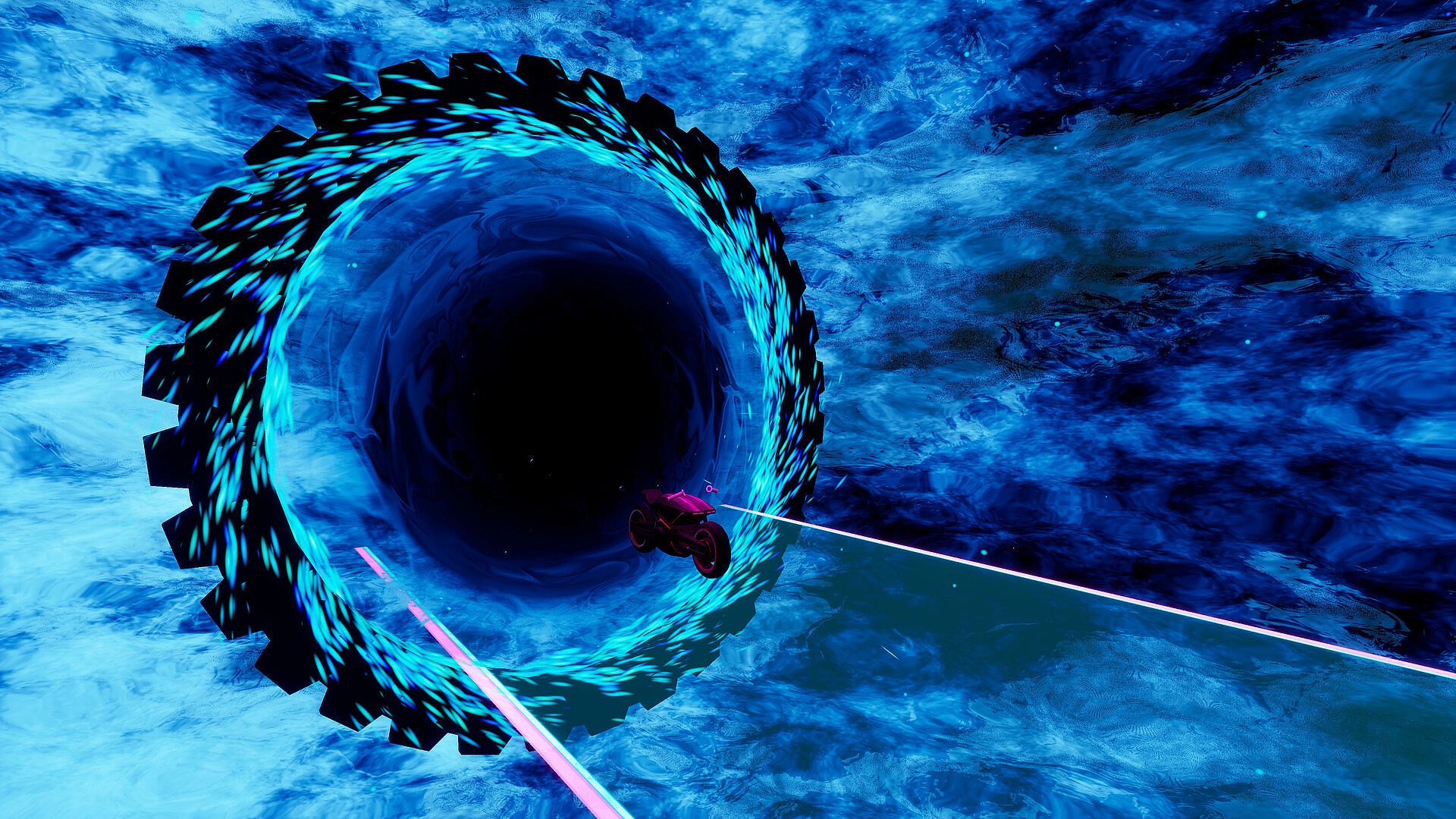 VR motorcycle controls. Original synthwave soundtrack. Dynamic atmosphere. Tracks that twist impossibly through space. Put on the headset. Enter the flow state.