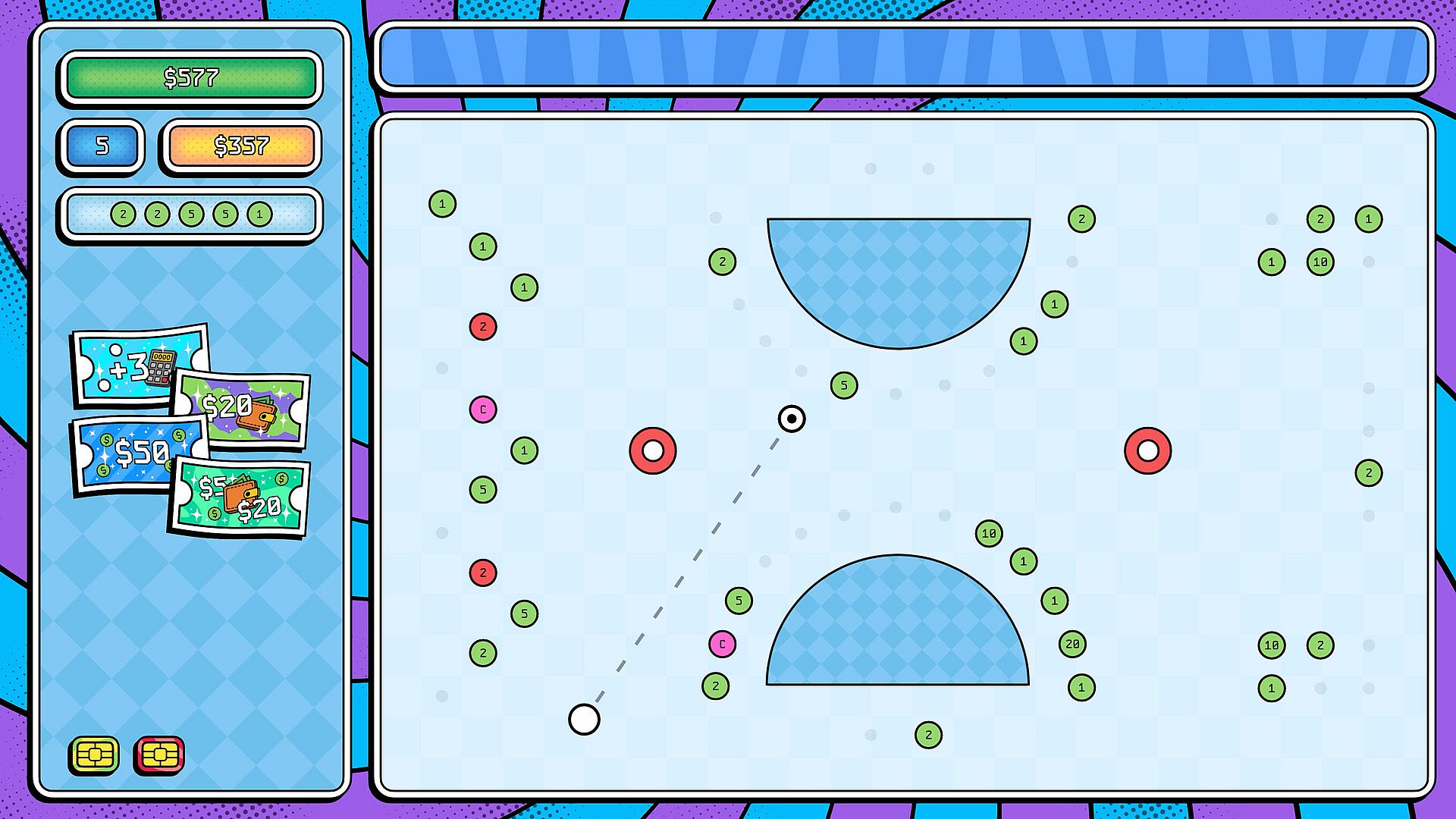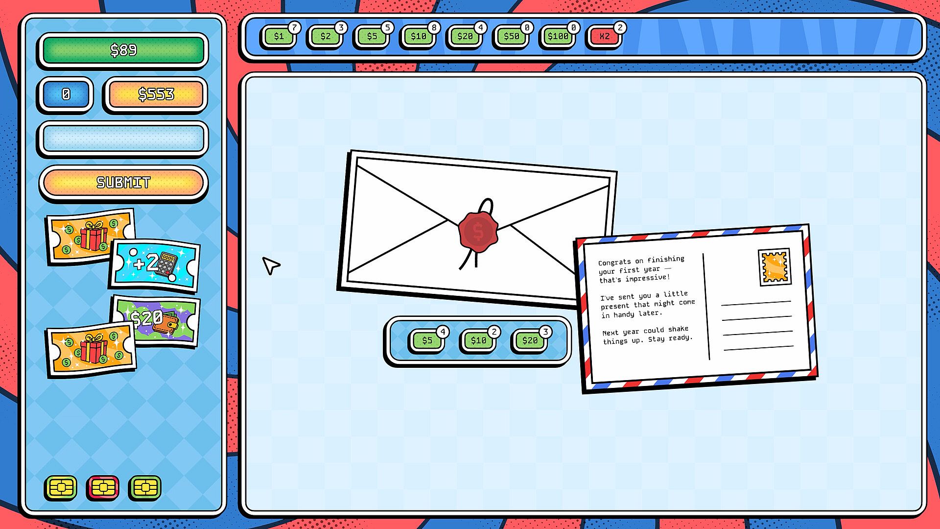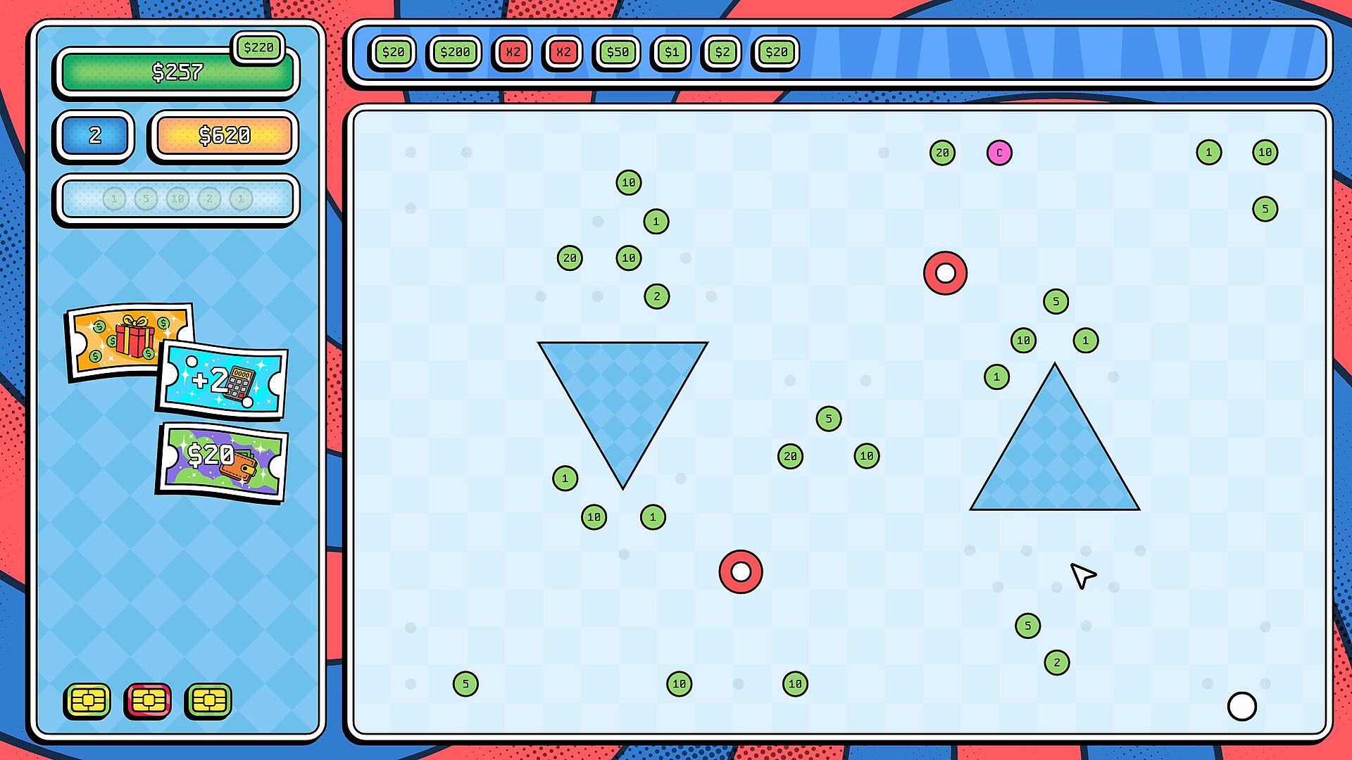 The game goes off the rails the moment you get your first banking card — a rule-breaking upgrade that opens up new strategies and wild combos. With these cards, you are crafting a plan to outsmart rising bills and crash the economy. In the heat of each round, you can also activate single-use coupons for an extra push — apply multiplication, refresh board or even cut 20% off your bills when it matters most.