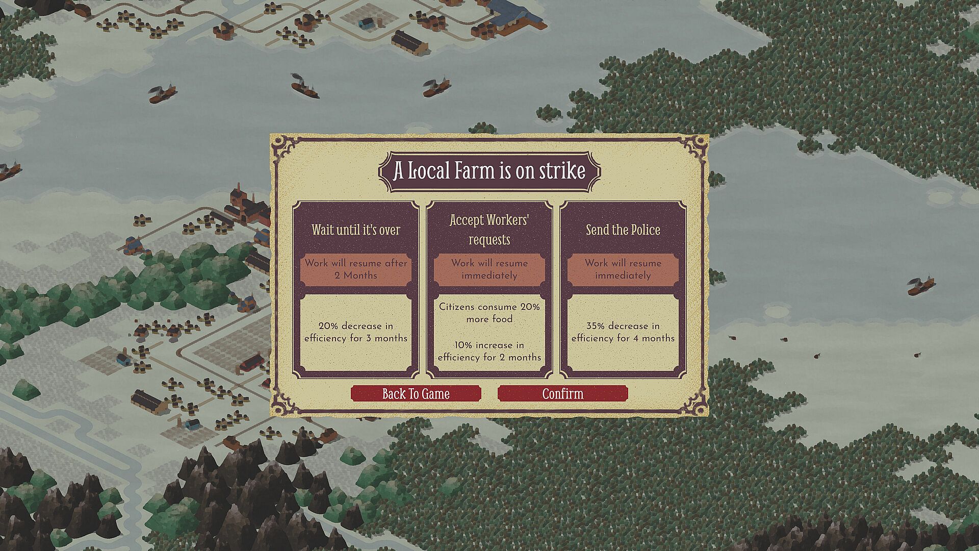As towns turn into cities, the needs of the population will evolve. Citizens at first need food and employment, but then will want consumer goods and services. Find the balance between their needs and the resources needed to satisfy them.