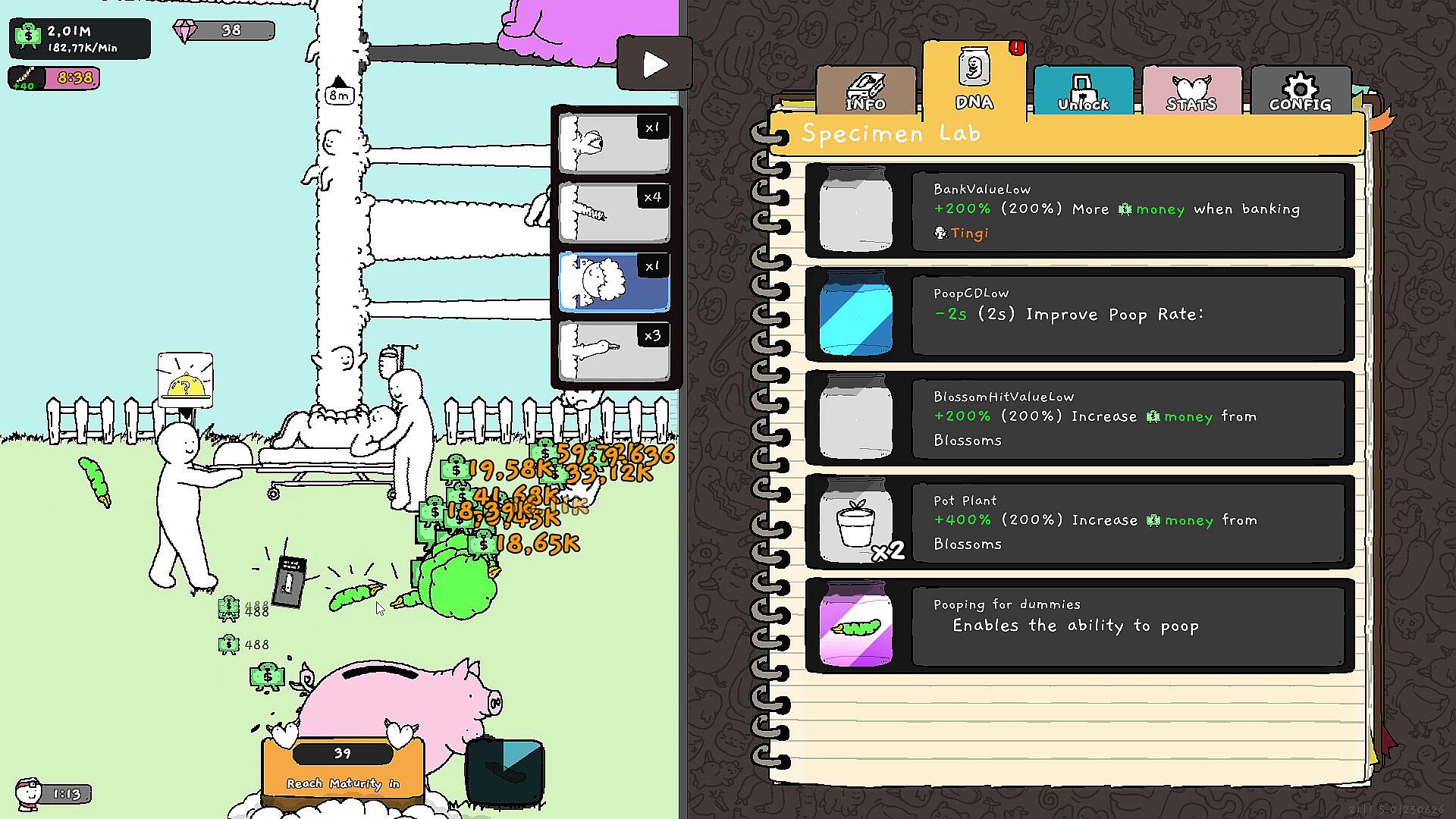 As newborn Babies tumble down the tree, they will bounce off Blossoms to generate cash. Make sure to place your Blossoms strategically to boost your yield. Next, slot Specimens to build runaway synergies that supercharge every Baby bounce.