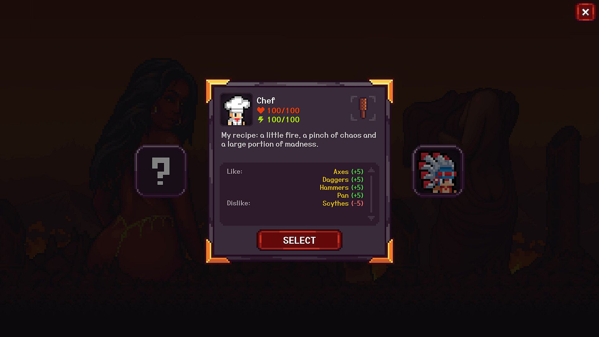 Chef (knives, axes, pots), Thief (daggers + critical hits), and more — each with unique traits and weapon preferences.