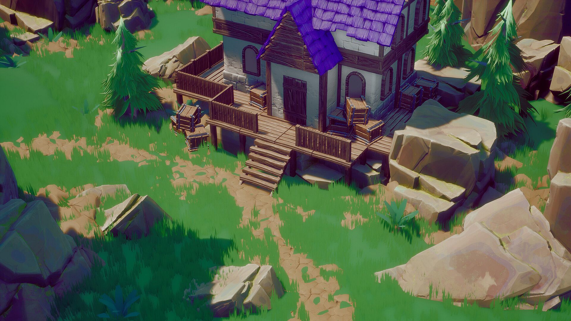 Clean, colorful lowpoly visuals with a focus on clarity and cozy atmosphere in 3D.