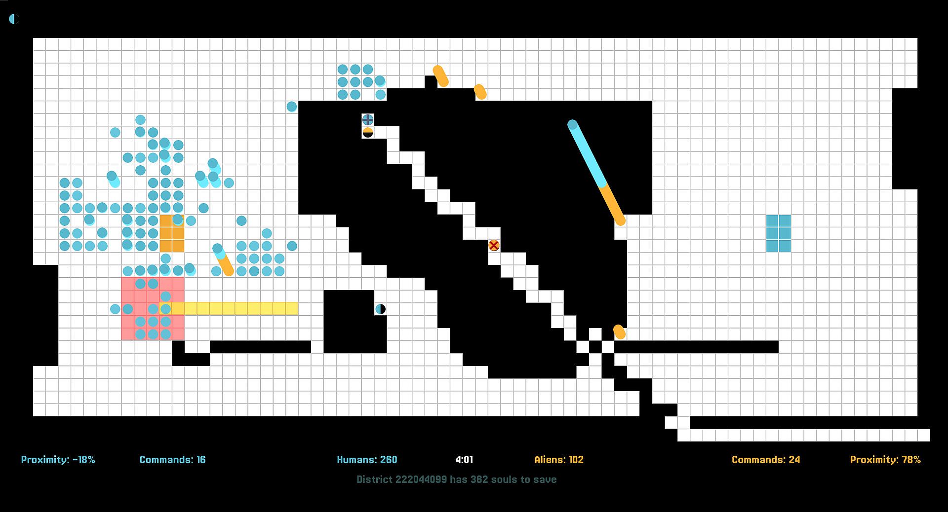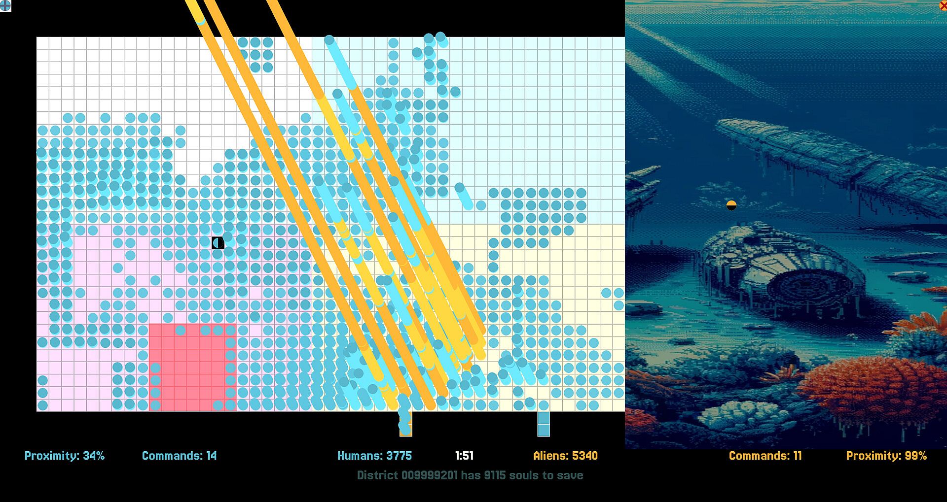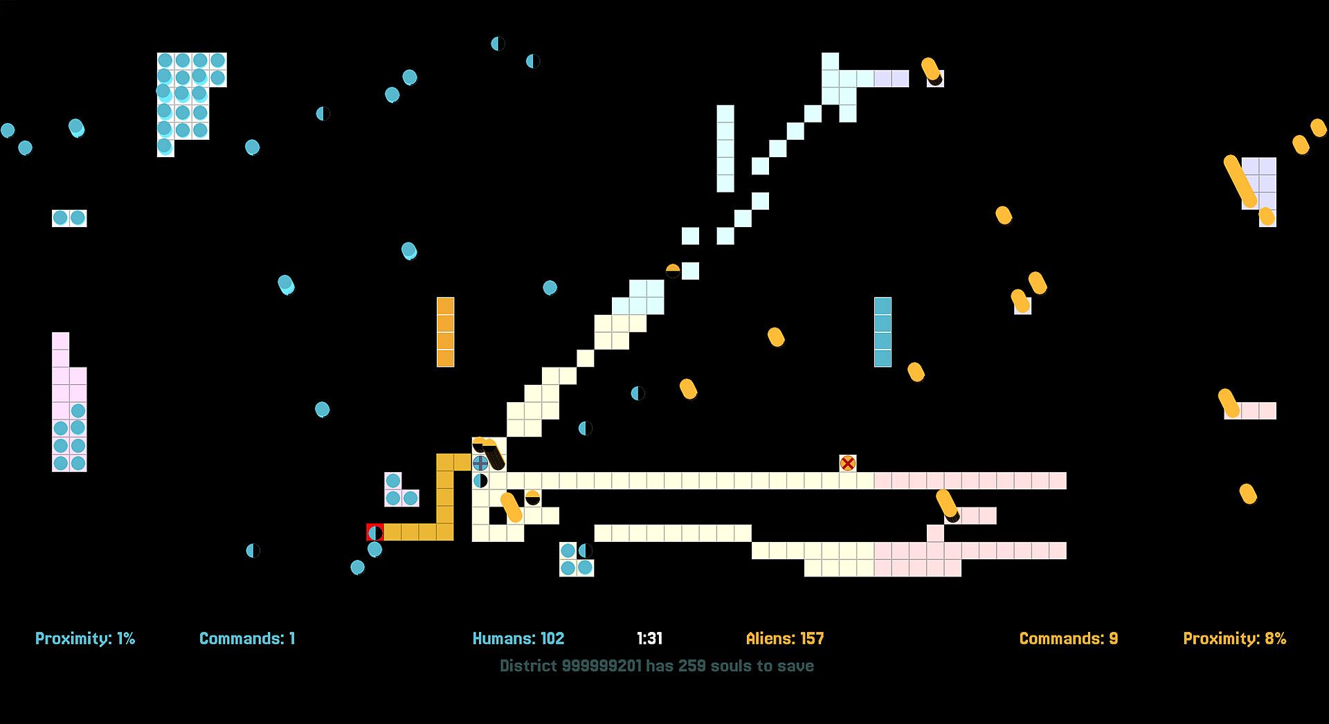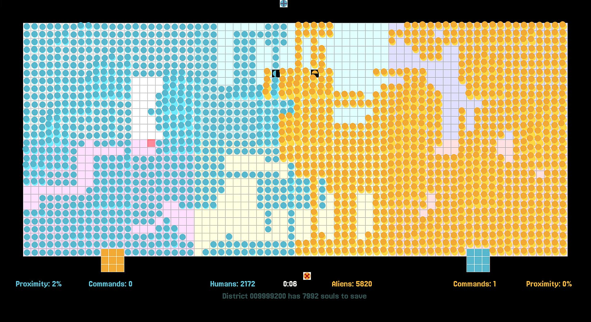Pods from a selected perimeter can be instructed to defend / attack a target area, terraform and redefine the topology of the district.