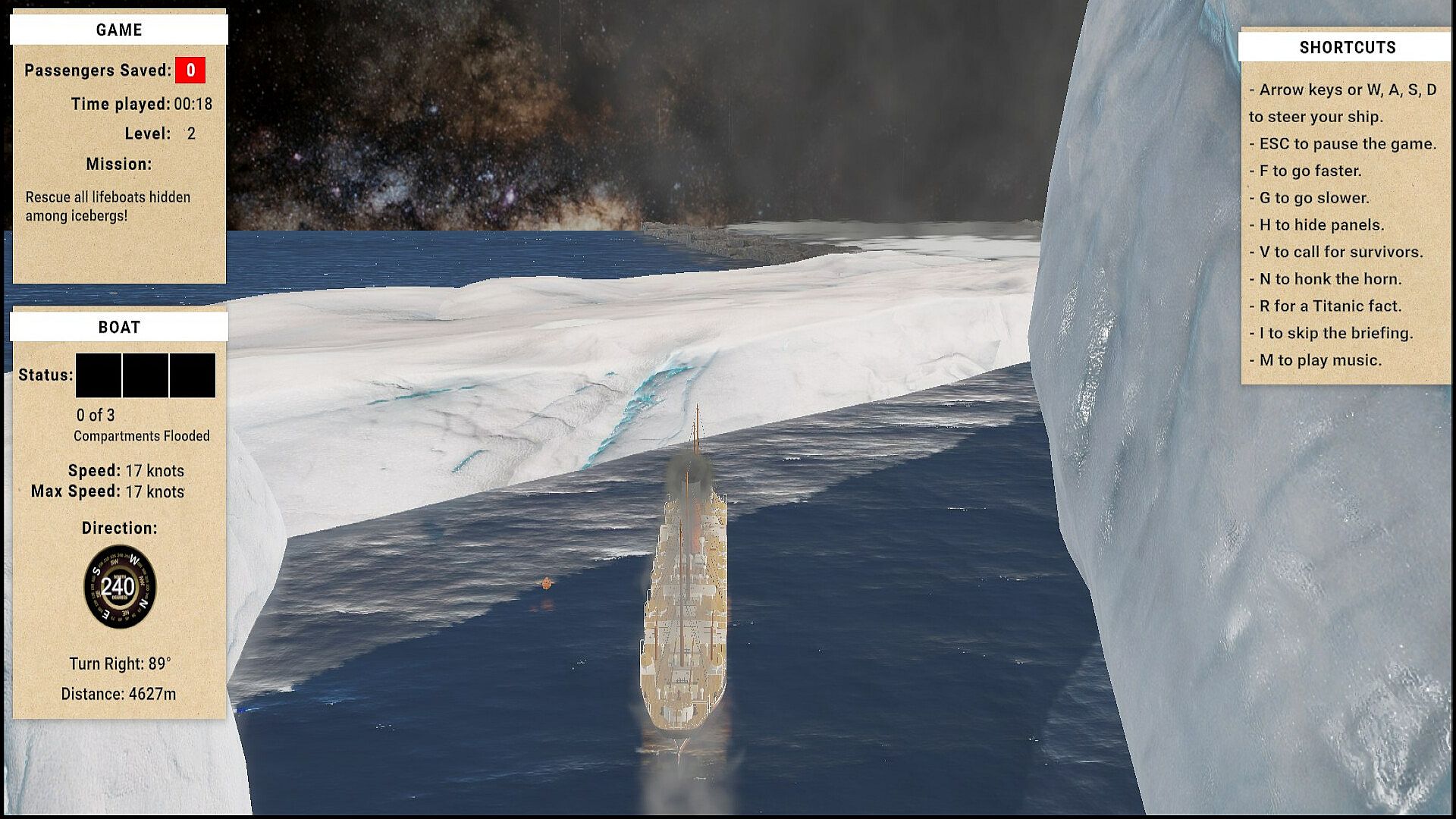 Prepare for a challenging voyage through four distinct levels, each testing your navigation skills and resolve. From dodging treacherous, moving icebergs in the open ocean to meticulously searching for hidden lifeboats, every maneuver counts. As you escort your rescued fleet, new dangers emerge, including additional rescue vessels and even more ice. The journey culminates in a perilous arrival, guiding the Carpathia through a rocky labyrinth to the iconic Statue of Liberty. In this high-stakes mission, a single collision means game over—but every soul saved adds to your score and cements your place in maritime history.
