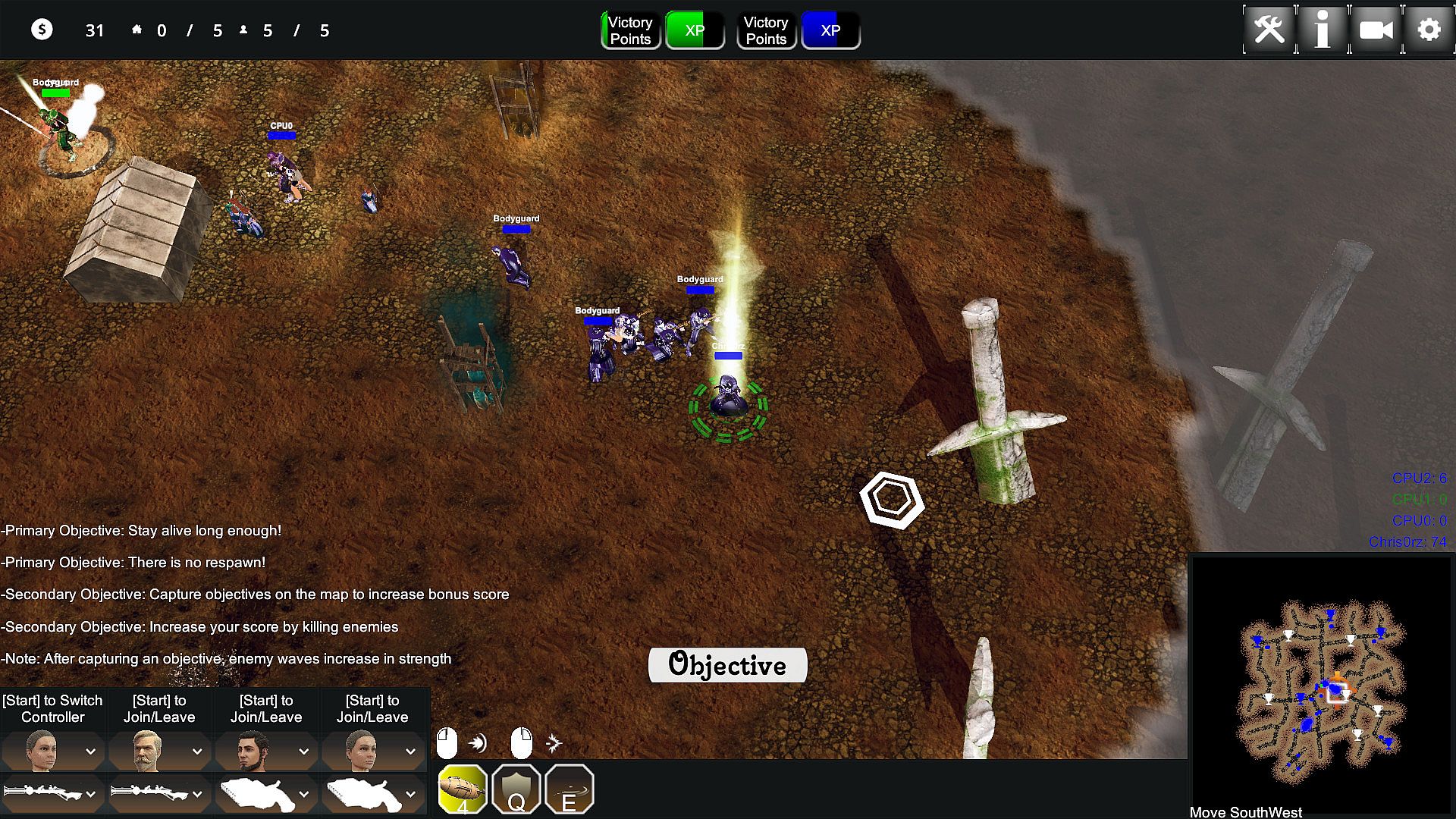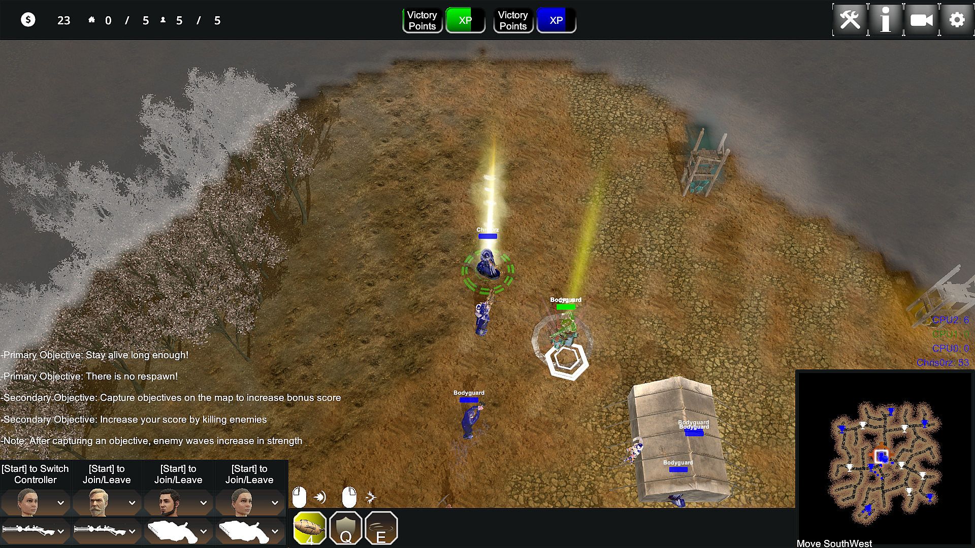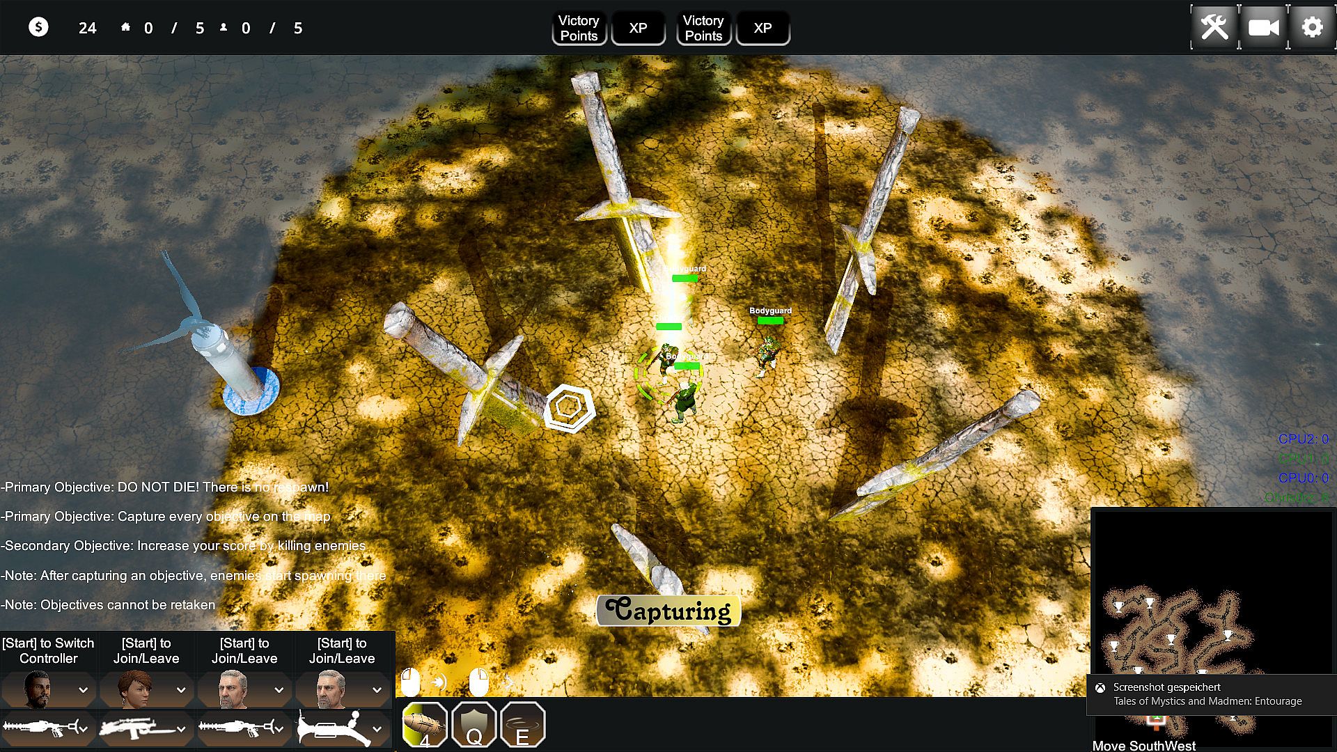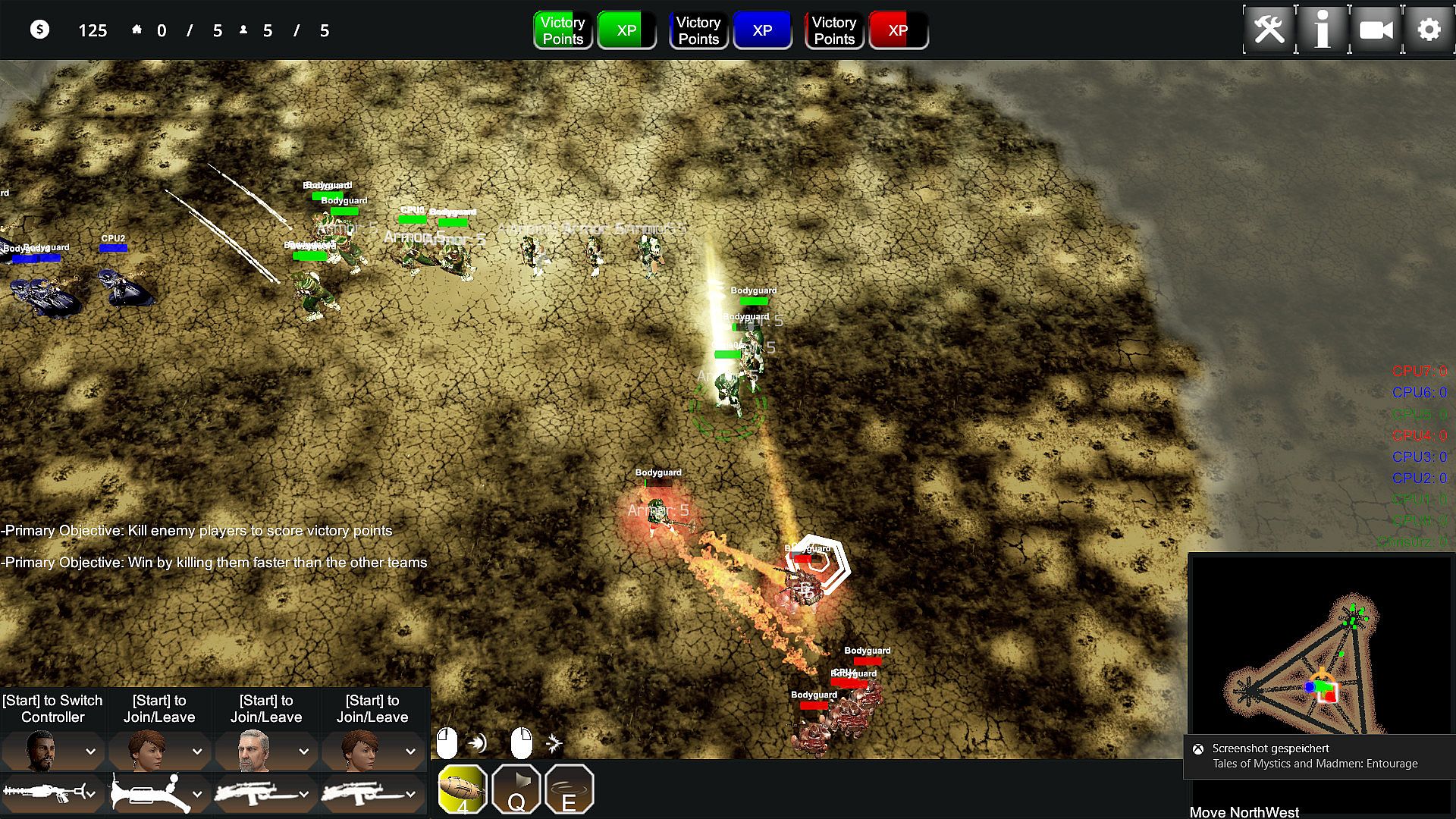 Tales of Mystics and Madmen: Entourage or TMM: Entourage for short is a top down shooter with a couple of RTS mechanics mixed in. You pick one of three sides and fight either the other two in various competitive or just one side in cooperative game modes. Each player character is joined by three bodyguards which may be controlled by your friends at the push of a button on a gamepad. The game offers various objective-based game modes which vary in length and style, with most of them sharing the same principles.