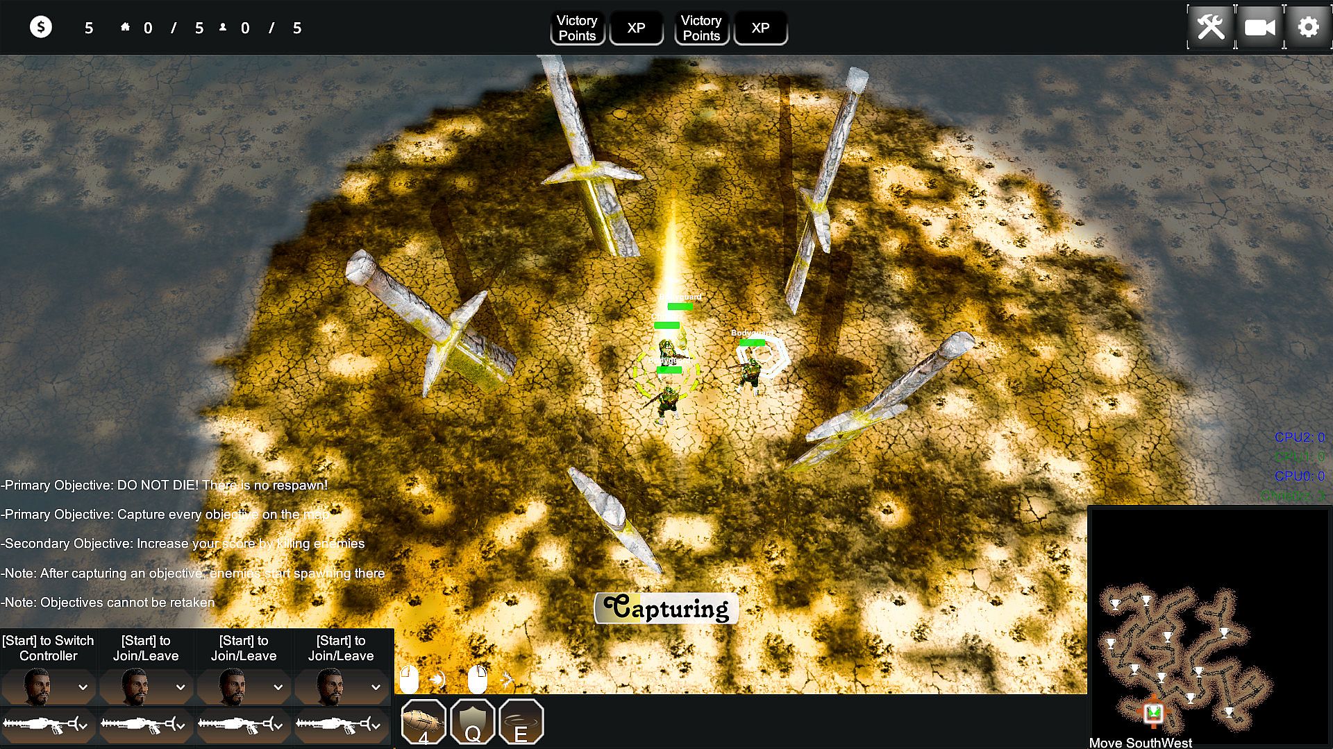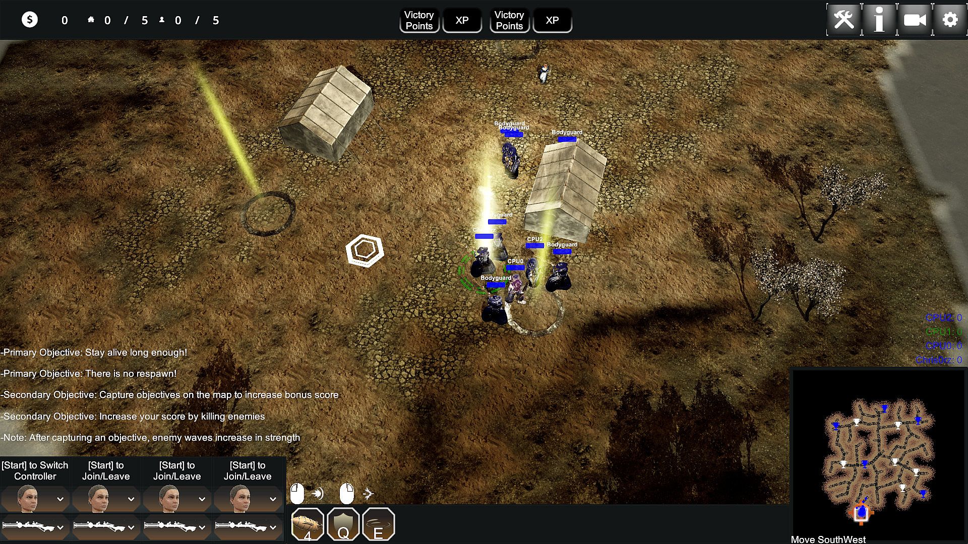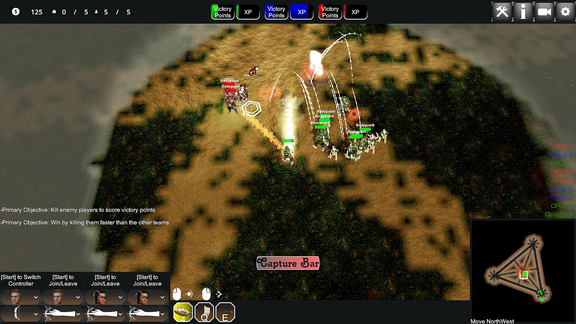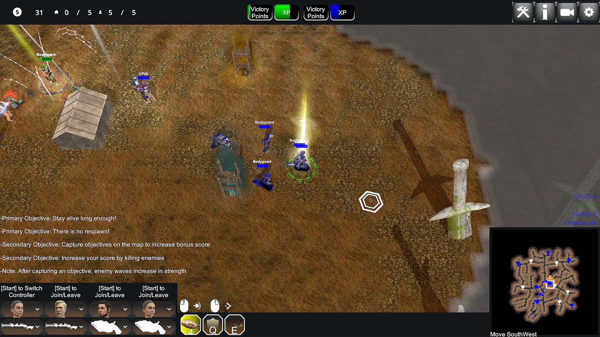 Tales of Mystics and Madmen: Entourage or TMM: Entourage for short is a top down shooter with a couple of RTS mechanics mixed in. You pick one of three sides and fight either the other two in various competitive or just one side in cooperative game modes. Each player character is joined by three bodyguards which may be controlled by your friends at the push of a button on a gamepad. The game offers various objective-based game modes which vary in length and style, with most of them sharing the same principles.