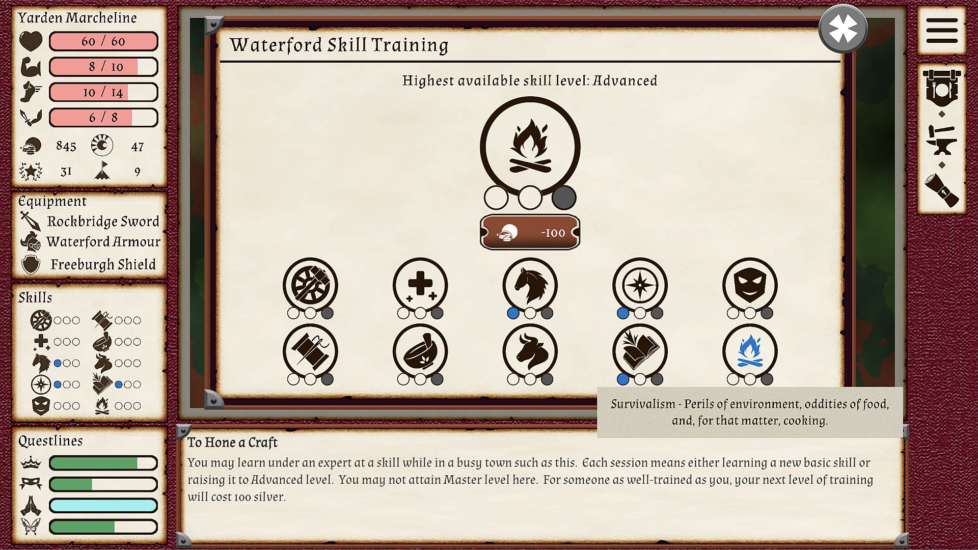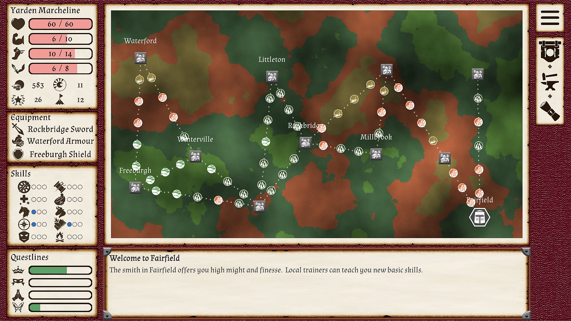 - Select routes and explore the procedurally-generated map, seeking the clues to advance each questline.