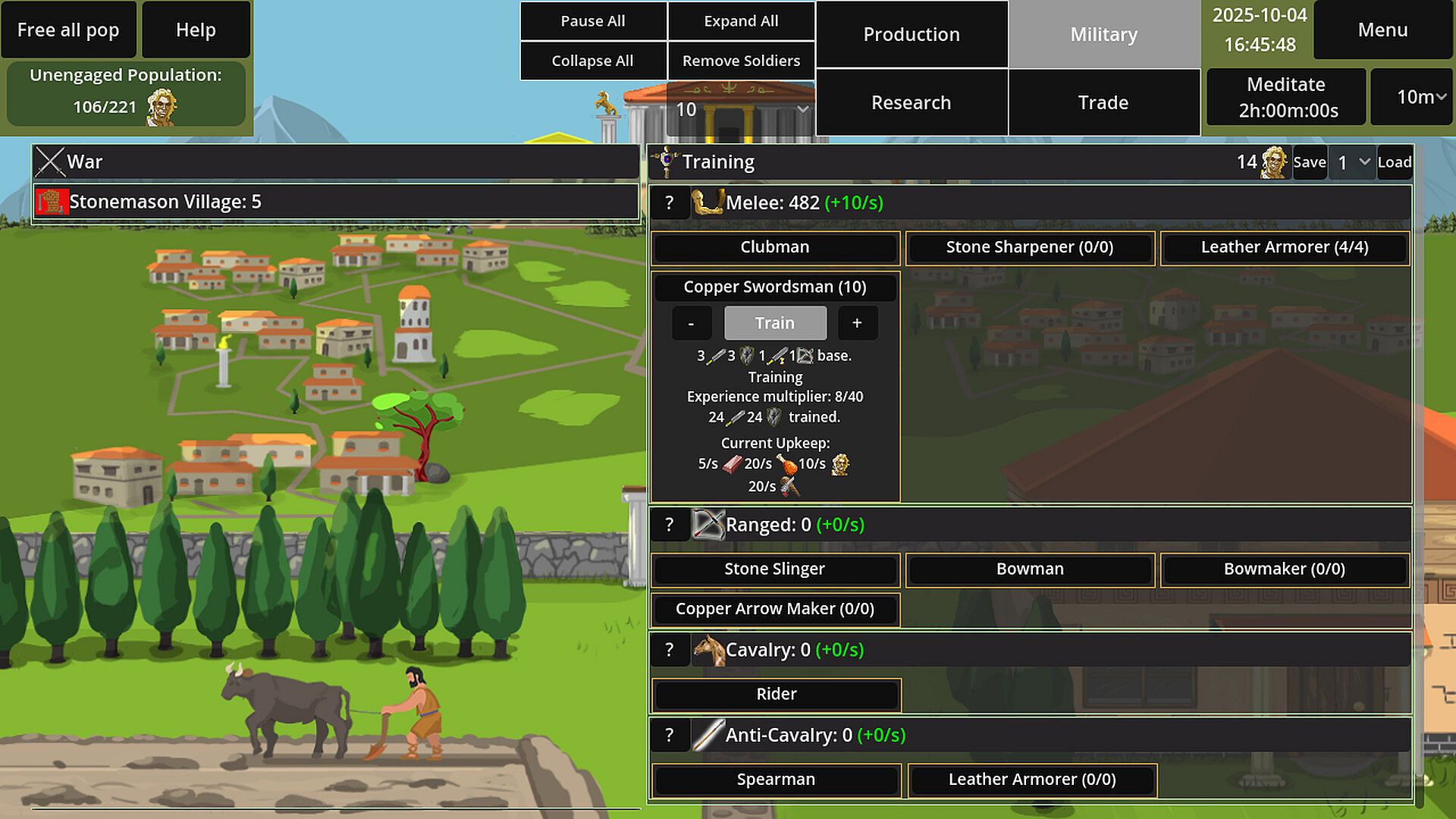 Finally, spend leftover resources to train up your military and attack neighbouring countries, to further upgrade your output with extra space as well as learn new methods of production from them. Battles are resolved in the autobattler fashion, where strengths and weaknesses of your units are clashing with those of your opponents.