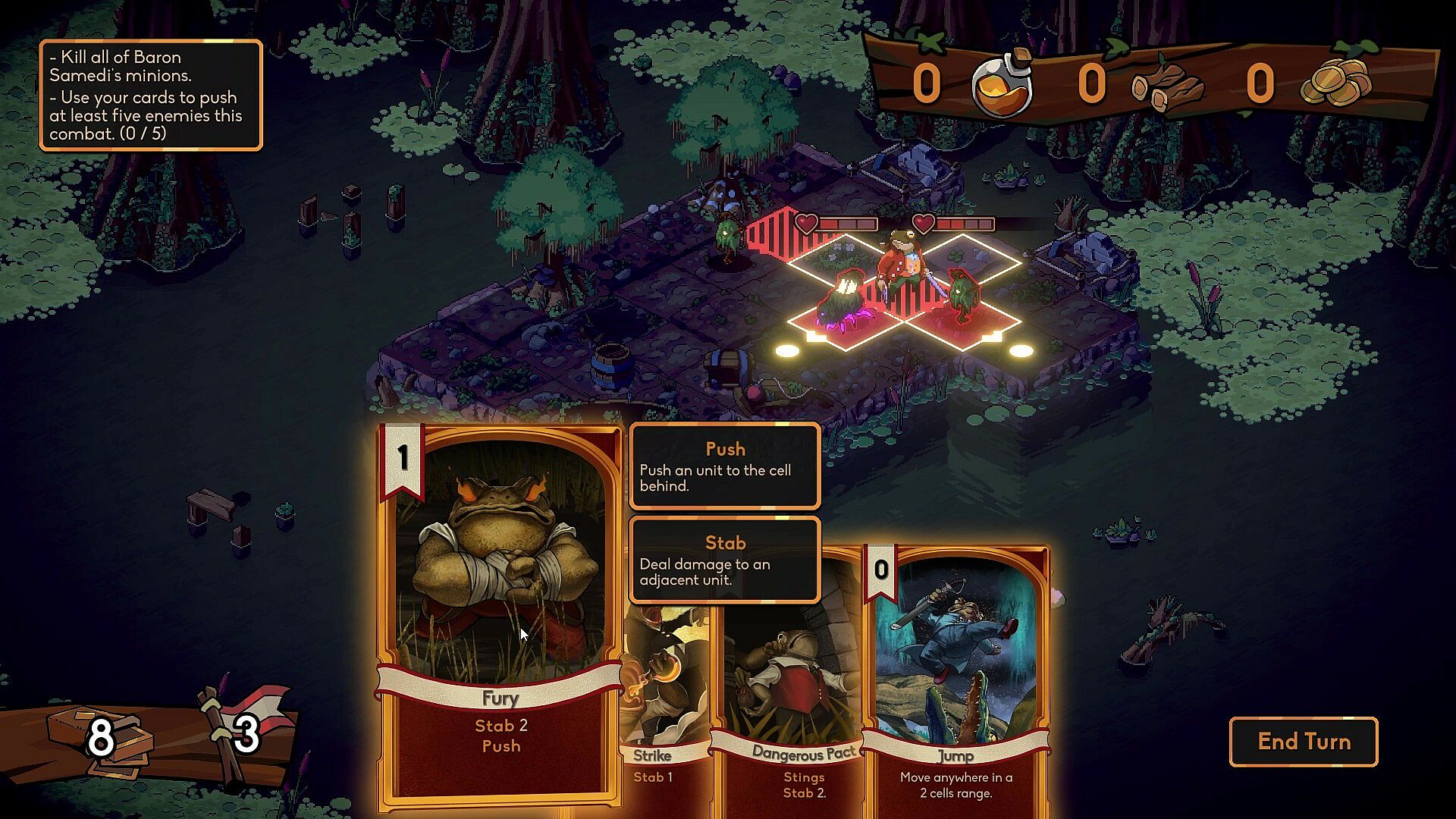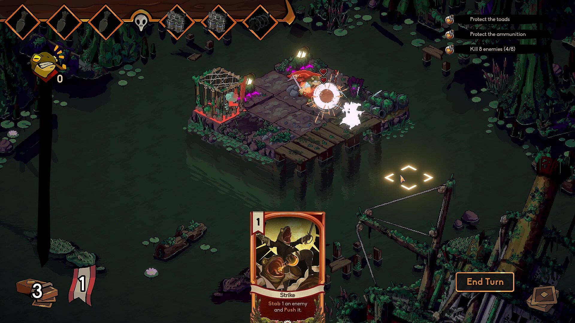 Choose between 3 different Toads each with their own traits, bonuses and weaknesses in grid-based combat. Each run is unique through three different islands, combat encounters and permadeath granting you upgrades at the end of each run.