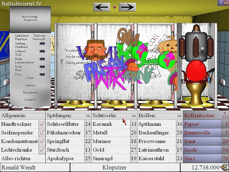 When you start up as a toilet cleaner, you will need to make sure that your SEED CAPITAL of 500,000 euros is wisely invested. Therefore, you purchase your first allotment and equip it with only what is absolutely necessary: basic model toilets and paper...
