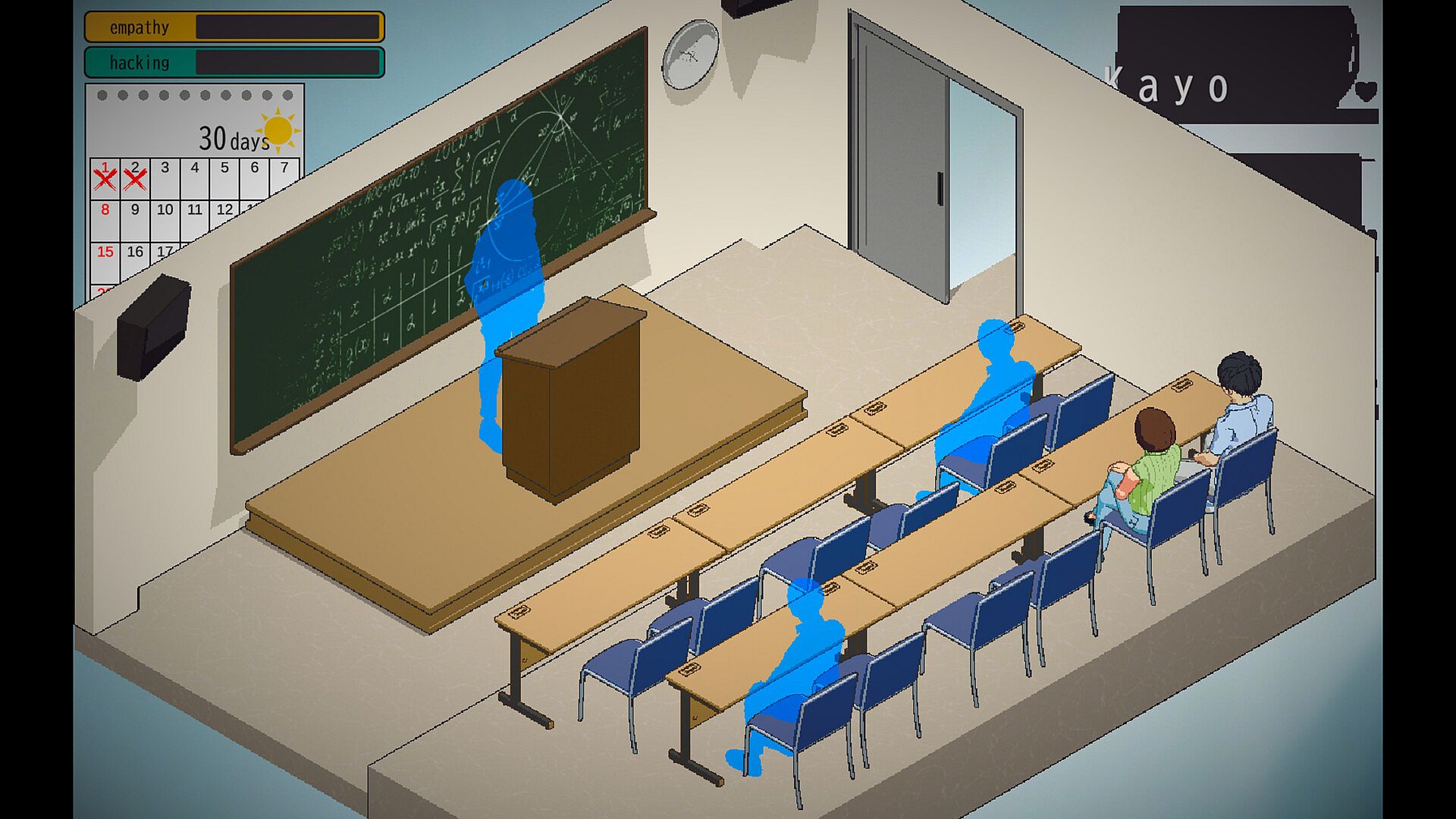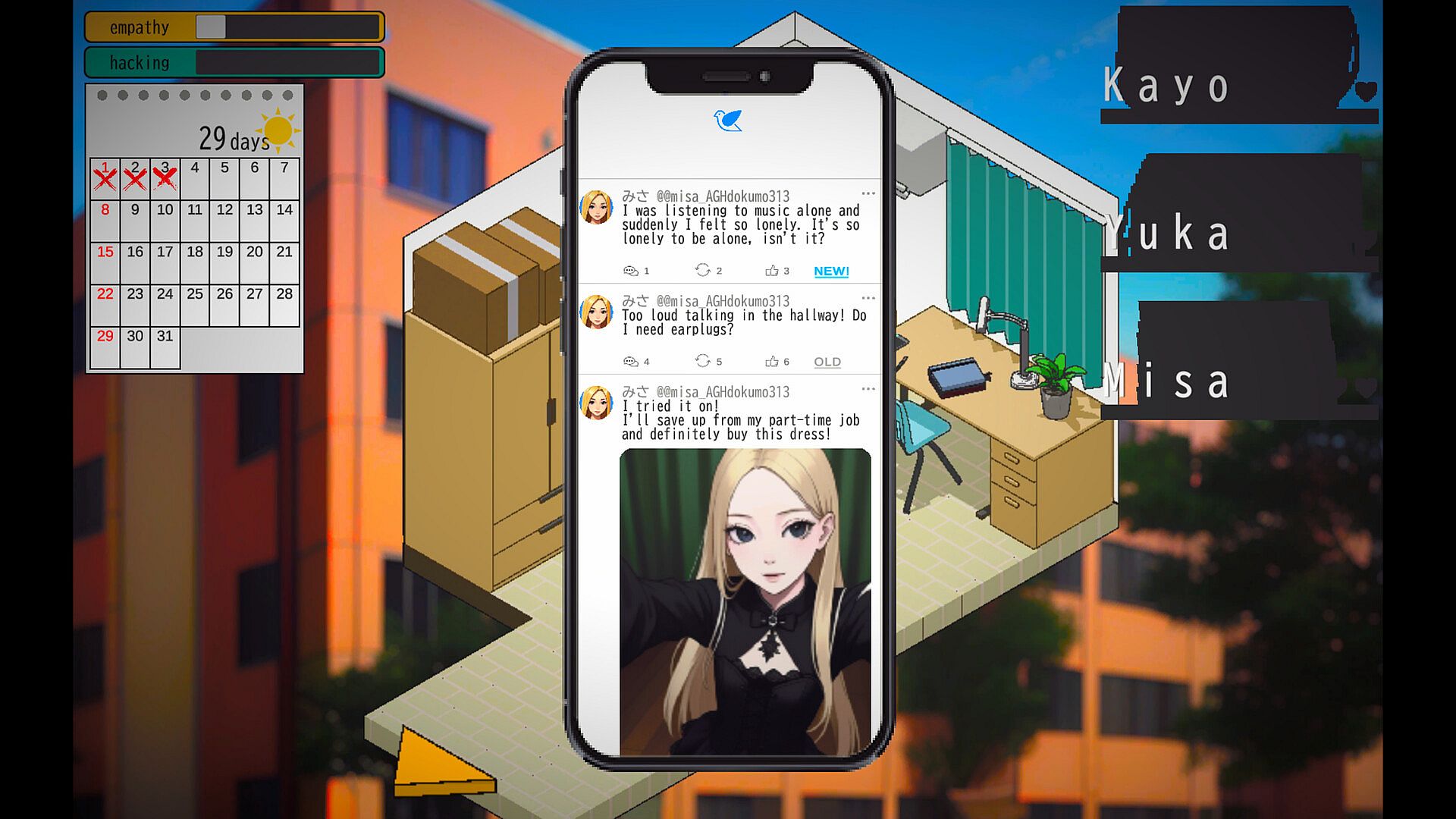 This is a romance simulation game that progresses with just a click. You can choose where to go from the protagonist's dorm room and move around the map. By checking social media, you can try to encounter the girls and get closer to them emotionally. Attending classes will earn you experience points, which can be used to acquire special skills. These skills allow you to see the affection levels of the girls or hack into their private social media accounts to gain deeper insights.
