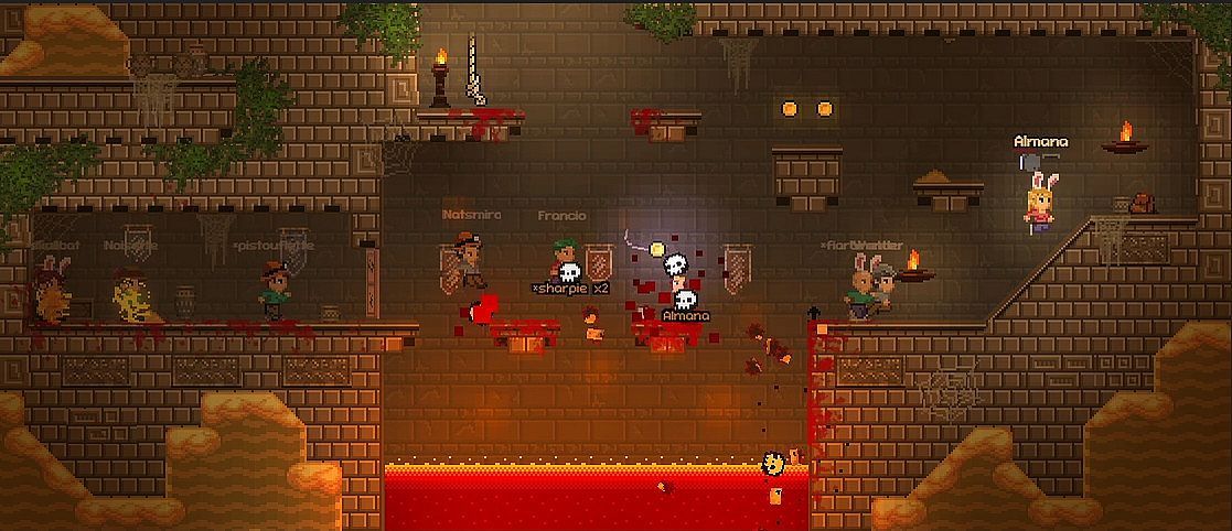 Tomb Rumble is a pixel art MMO platformer, where adventurers compete to retrieve ancient treasures in lost temples, cursed ruins and more. Push other players into deadly traps to be the first to escape !... or be the one to fall in a lava pit.