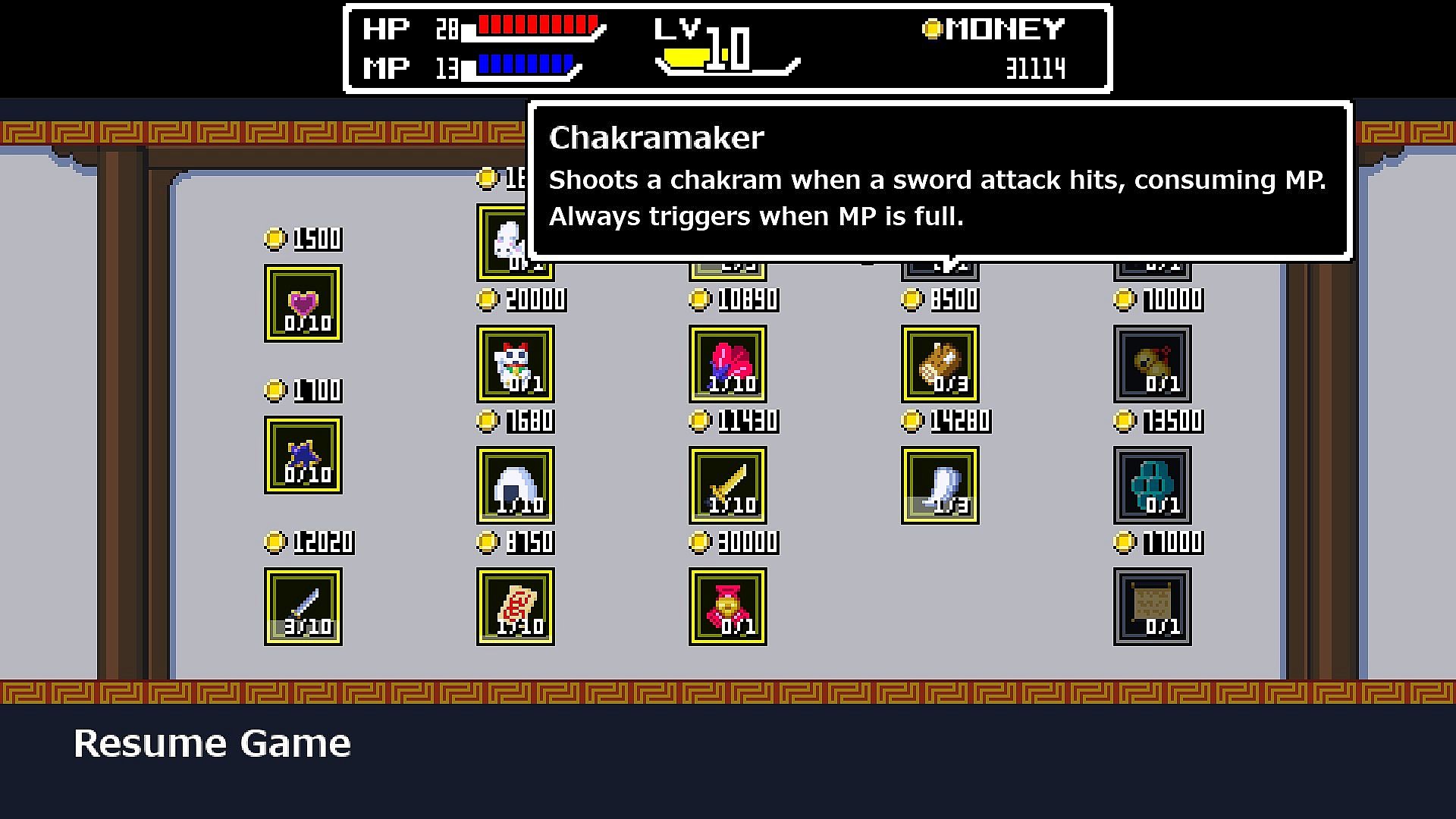There are almost 20 different kinds of upgrades.Some can be bought at a shop, others are obtained by defeating bosses, and a few are in hidden areas.