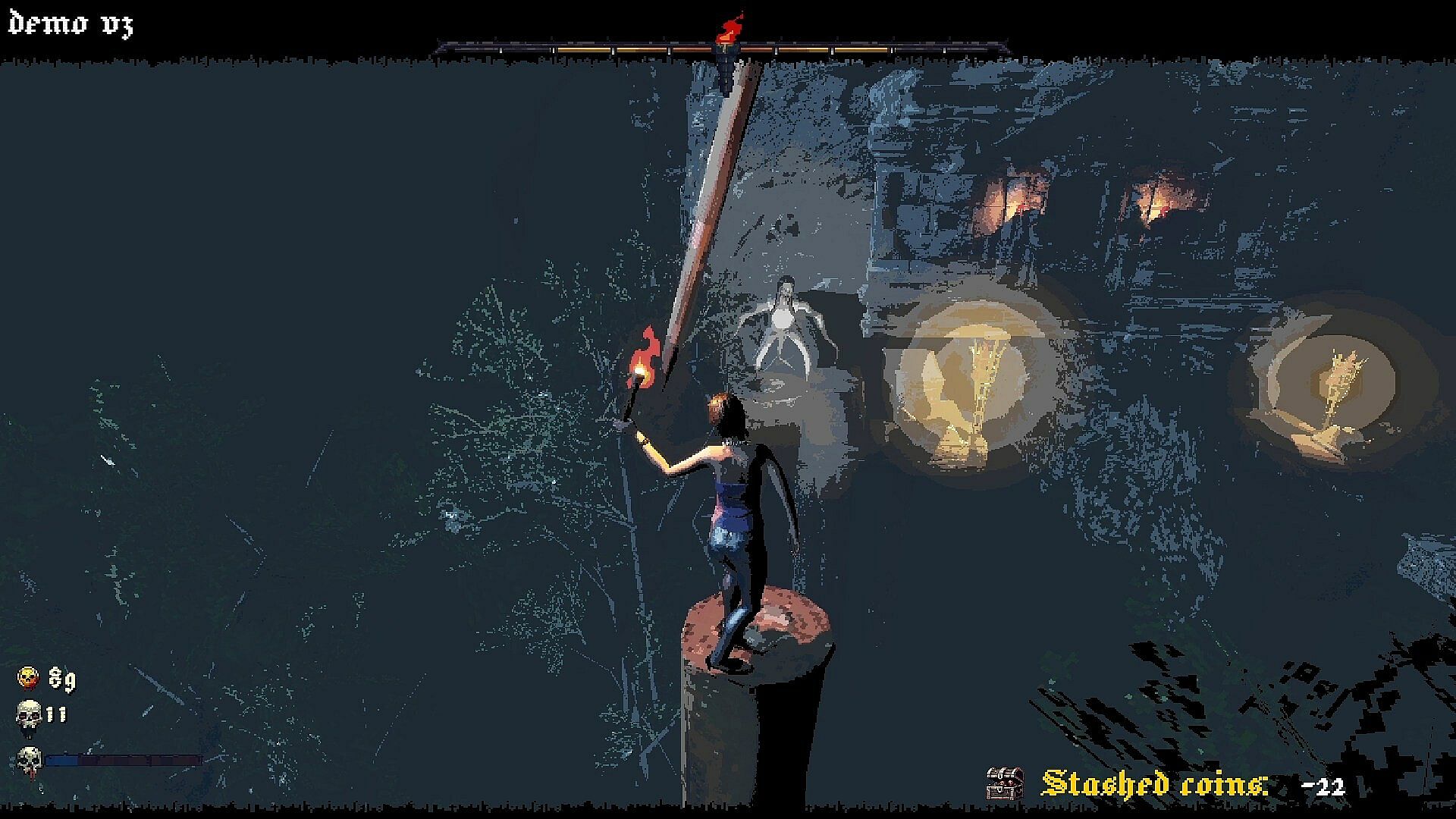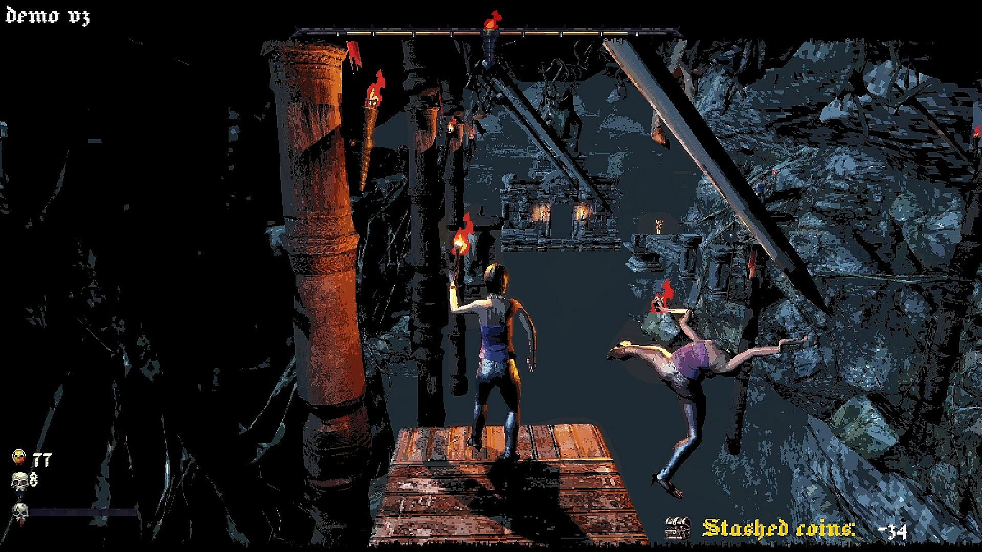TorchR Runners: Demastered is a retro, co-op precision platformer that tests your reflexes, sanity, and teamwork. In a world shrouded in darkness, you and your fellow players carry torches that slowly extinguish. As your light fades, so does your sanity. Teamwork is crucial to overcome the challenges ahead, and if your torches or sanity depletes, it’s gonna get even more difficult.