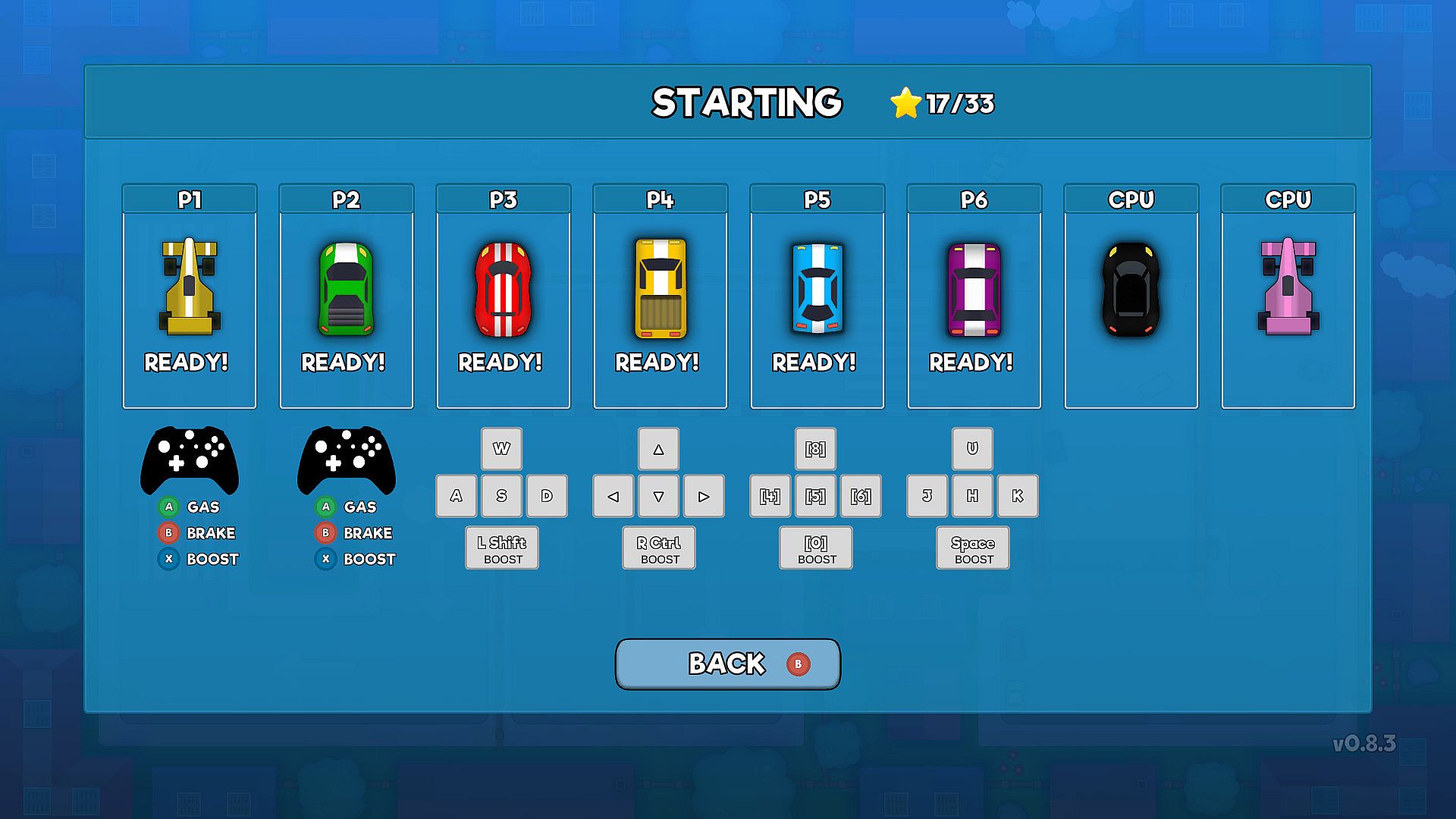 • 7 Cars – Each with unique speed and handling