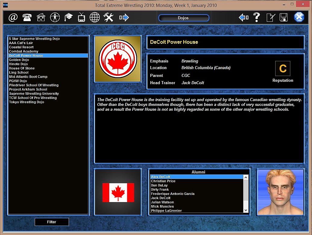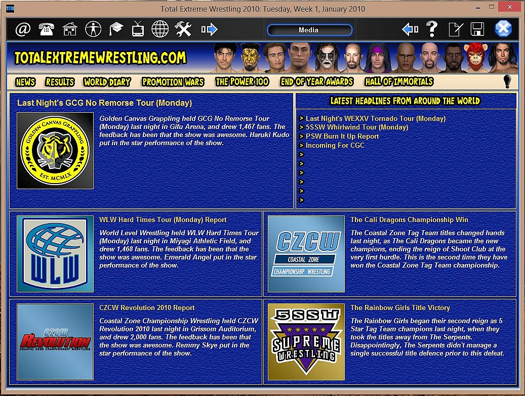 Step into the world of wrestling in World Total Extreme Wrestling 2010. In this simulation title, you play the role of a wrestling promoter, and it is up to you to steer your company to the top of the industry! You are in control of everything – deal with superstar egos, negotiate through wars and alliances with other wrestling promotions, and deal with the demands of TV networks. Do you have what it takes to lead your wrestling promotion to the top of the industry?