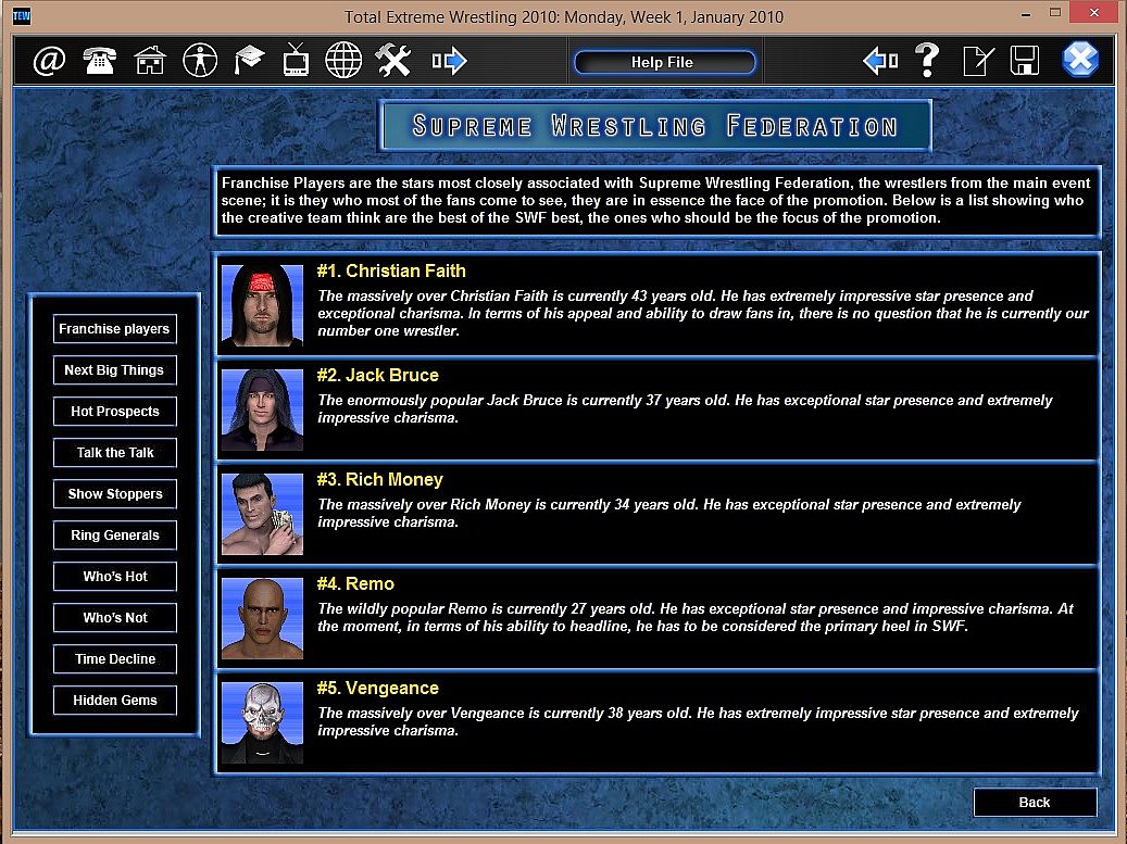 • The most accurate wrestling simulator ever made, including wrestlers with styles that can change and over time due to injury, age, or skill level changes.