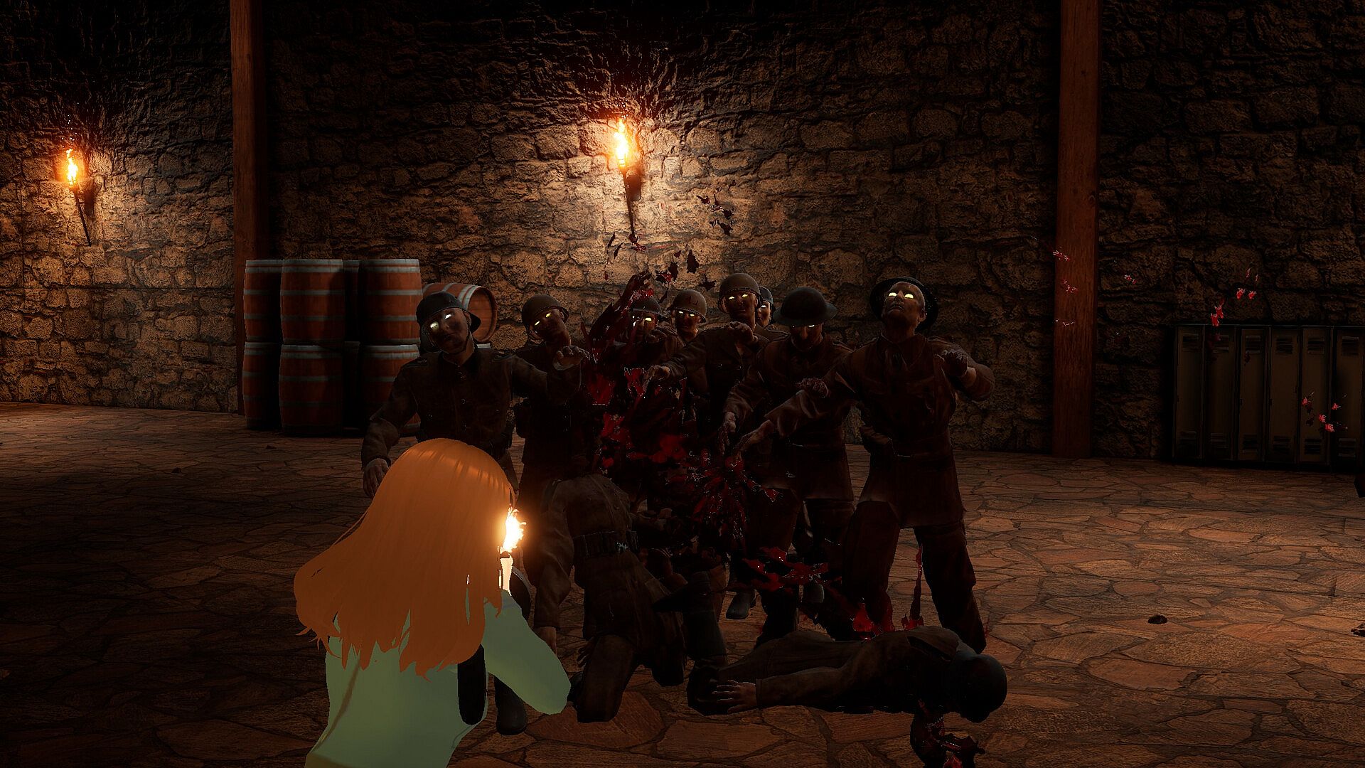Totenkampf is a classic round based survival 1st and 3rd person shooter with anime girls and magical elements to spice up the setting and gameplay. Each girl has her own elemental abilities, and can also gain more powers by exchanging points at altars that provide a small link to their world. Aquire powerful weapons from WW2 and combine the powers of both worlds to cut through countless waves of zombies.