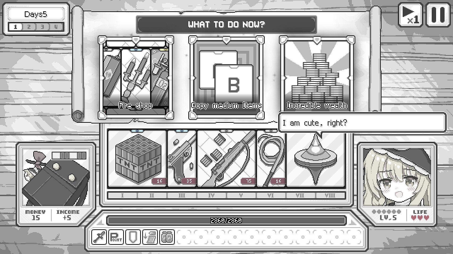 In the daytime, You will encounter various events, where you can purchase items, learn skills, gain exp, fight random enemies, or even change the effect of an item!
