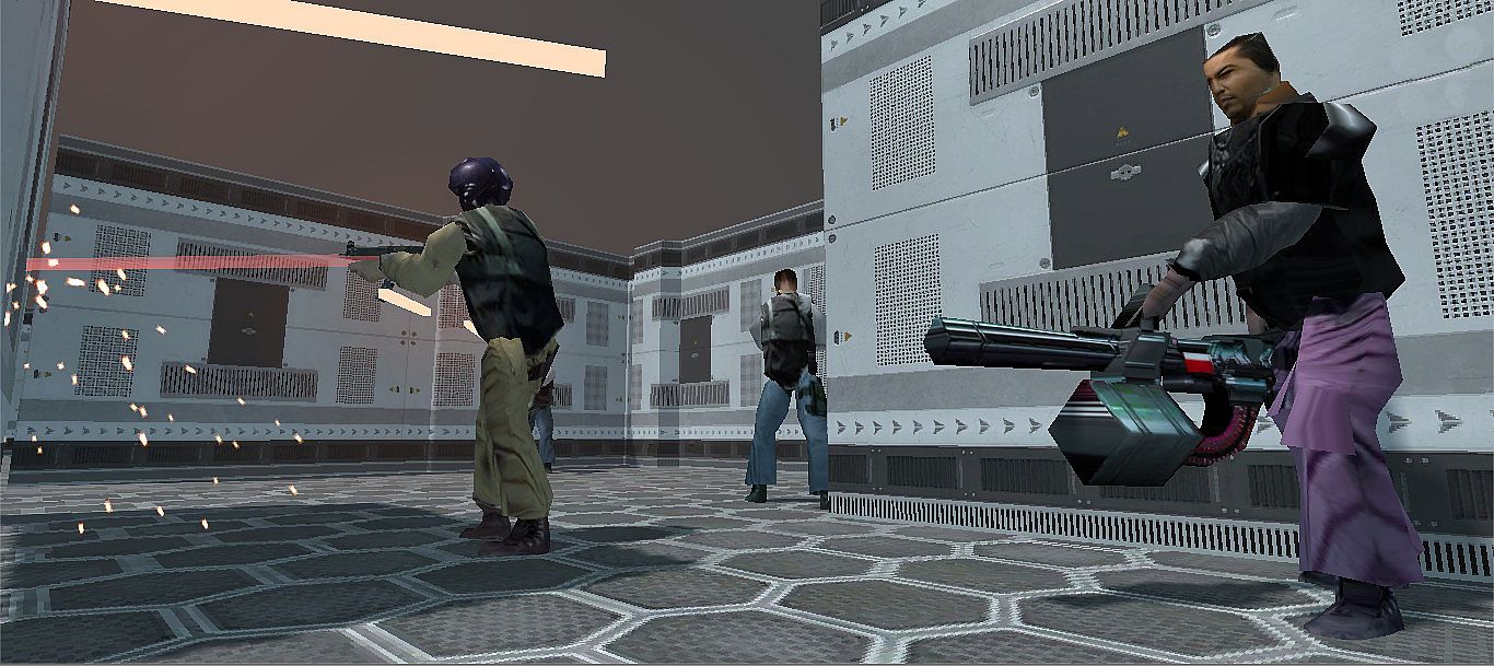 Apart from the standard white-shirted baddies, who just use the same weapons as you, there's also the big bad: a brute wearing oversized shoulder pads and using a weapon that's probably heavier than him. He's tough, rare, and his weapon will shred you the moment you walk into its line of fire - but at the same time, his rotation speed is slow enough that if the environment allows it, you can easily play ring around the rosie with him and shoot him without getting hit once. Basically, make sure you see this guy before he sees you, or you'll have a bad time.
