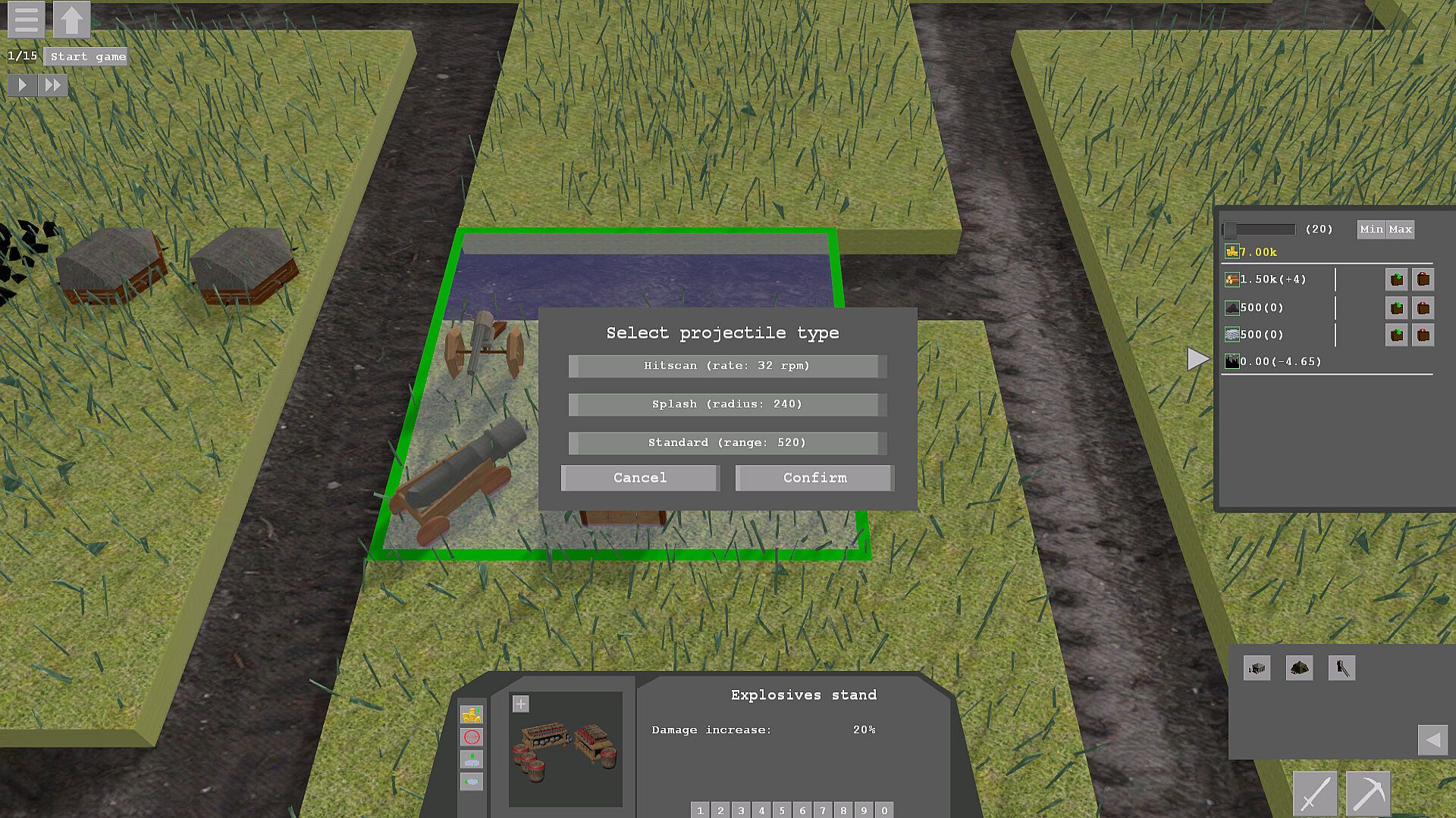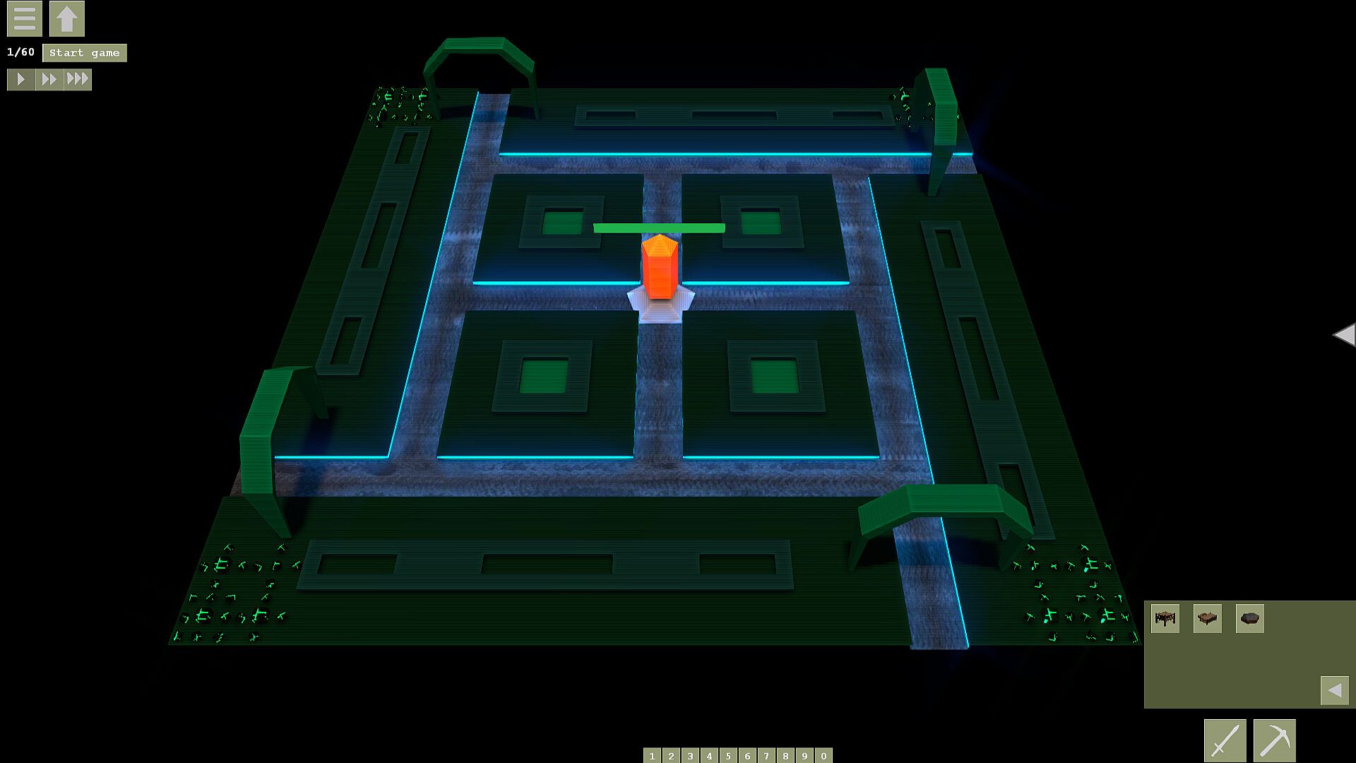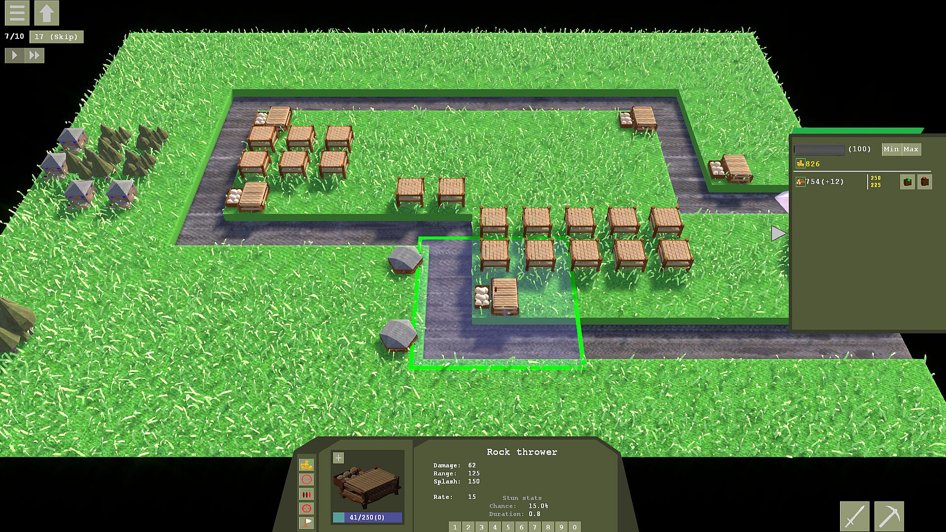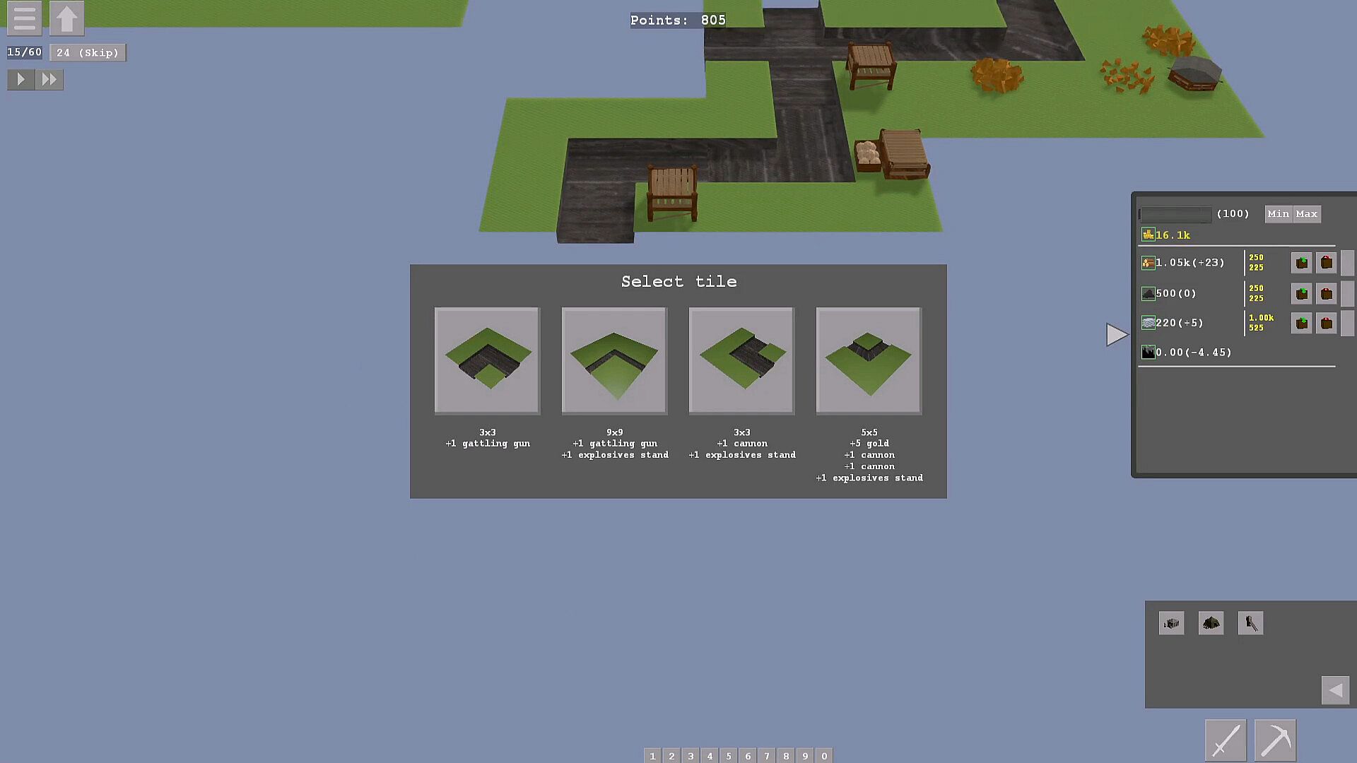 • Maze builder - Similar to tile hunter, the player starts on a small island. However instead of the path being generated through tiles, here the player dictates the path the enemies have to take by blocking their path using buildings. In addition, this game mode also has roguelike elements in the form of "Blocks", where the player can select one of the given "Blocks" and position it somewhere. These "Blocks" can also change enemy pathing or contain special traits to help the player advance further.