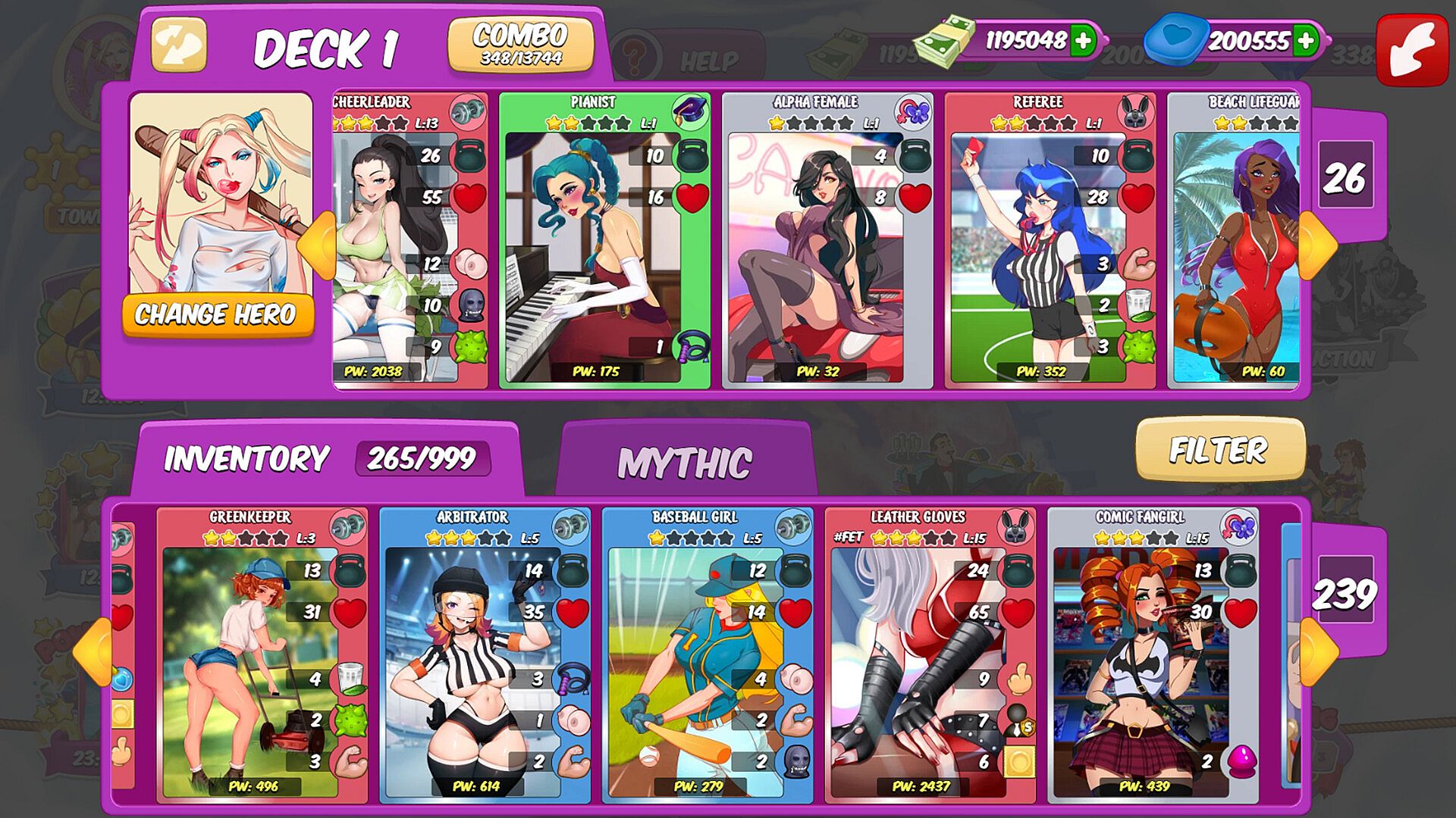 | Characters – cards depicting girls of different occupations or types. They may be of five different rarities: common (gray), rare (green), epic (blue), legendary (red) or mythic (golden). During the battle, you can put together a Character card and an Item card for a more powerful combo. Items – cards depicting all kinds of things. Just like Character cards, they may be of five different rarities. During the battle, they could be combined with Character cards to produce a combo. Residents – cards depicting girls resident in a certain neighborhood. They have better health (HP) and unique skills. They are particularly useful as defensive cards, and their skills produce a strong effect on the outcome of the battle. Combos – cards featuring the fusion of a Character girl with some Item. Combos are investigated in the Workshop and are key to winning in battle. Combos are much stronger than the sum total of the cards used to produce them. |