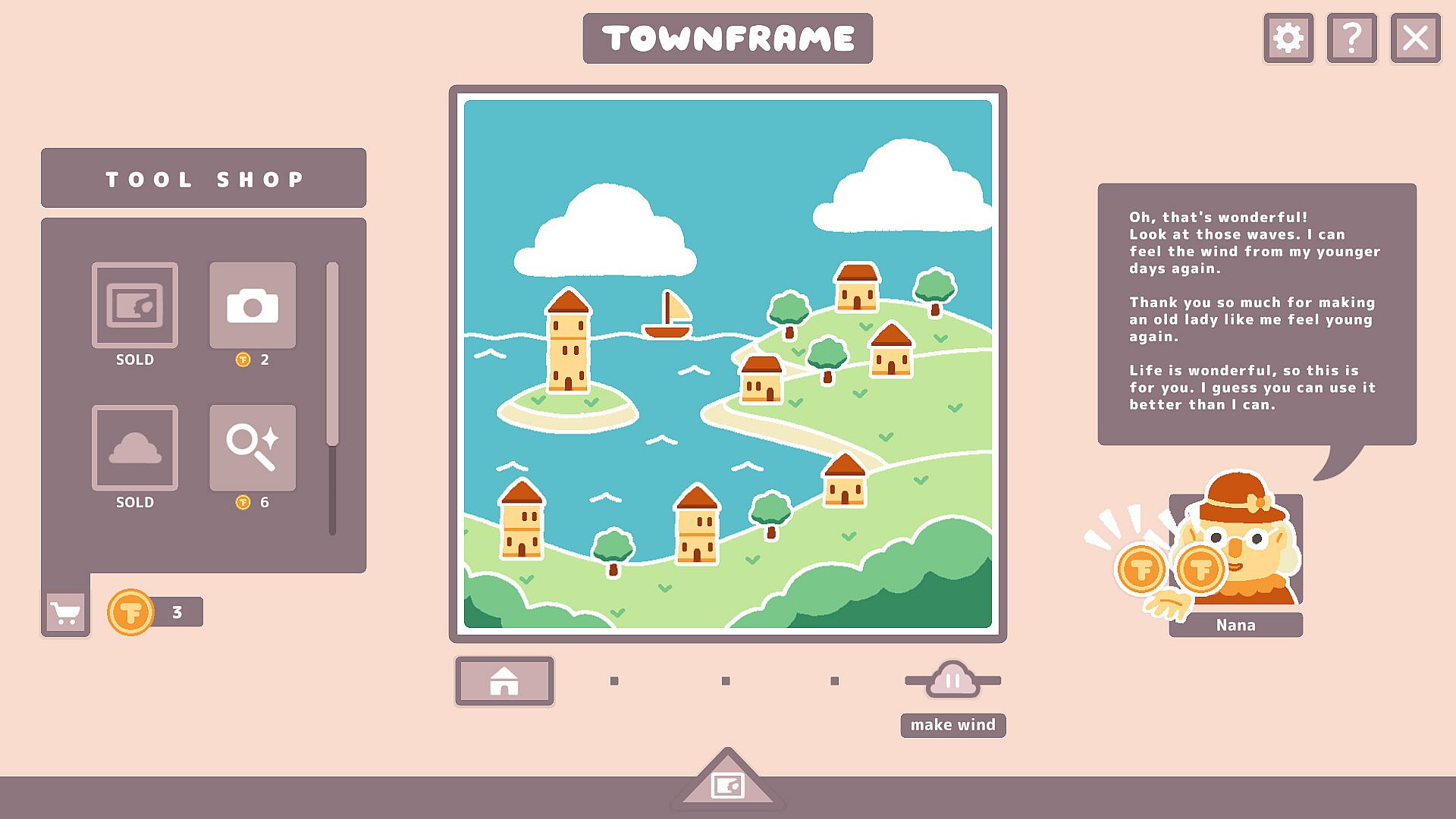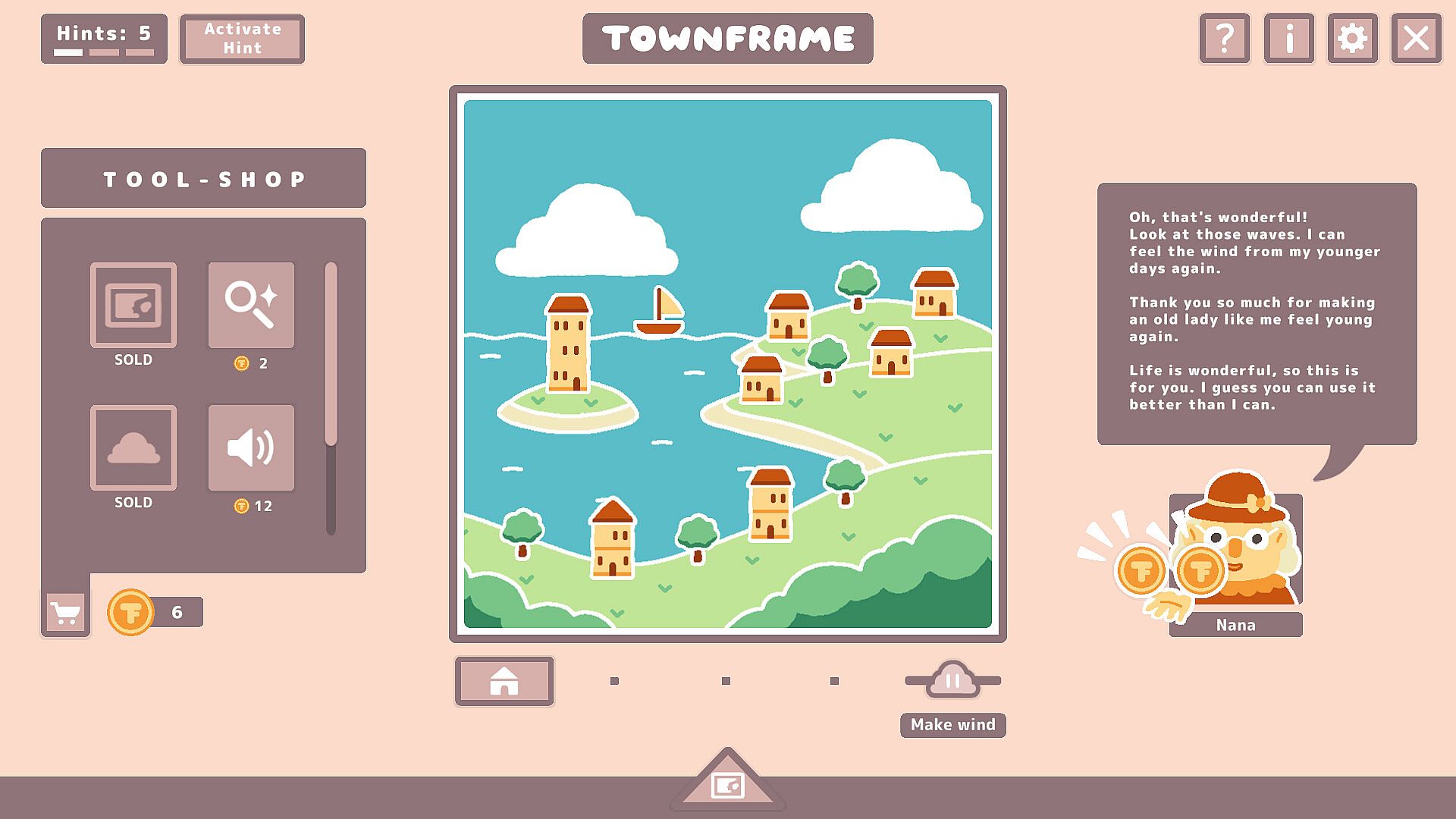 Buy tools to uncover hidden things with a magnifying glass, change the wind direction in the scene, take interesting photos or listen to the soundscape of the towns to solve the little story puzzles in the world of Townframe.