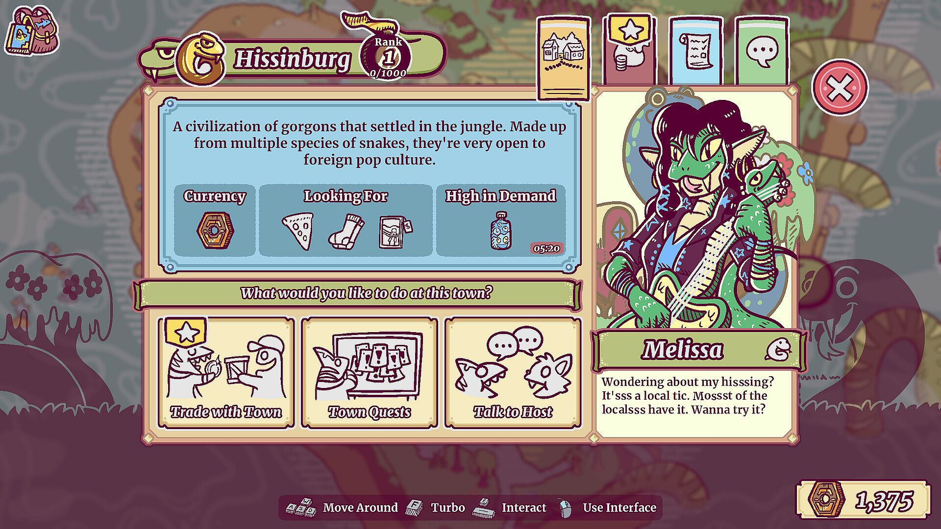 Visit charming towns and meet their colourful inhabitants, from sharkfolk and slimes to stonelings and beyond! Trade goods for profit, take on quests to build your reputation, and unlock upgrades and cosmetic rewards. Each town offers its own culture, curiosities, and characters to discover.
