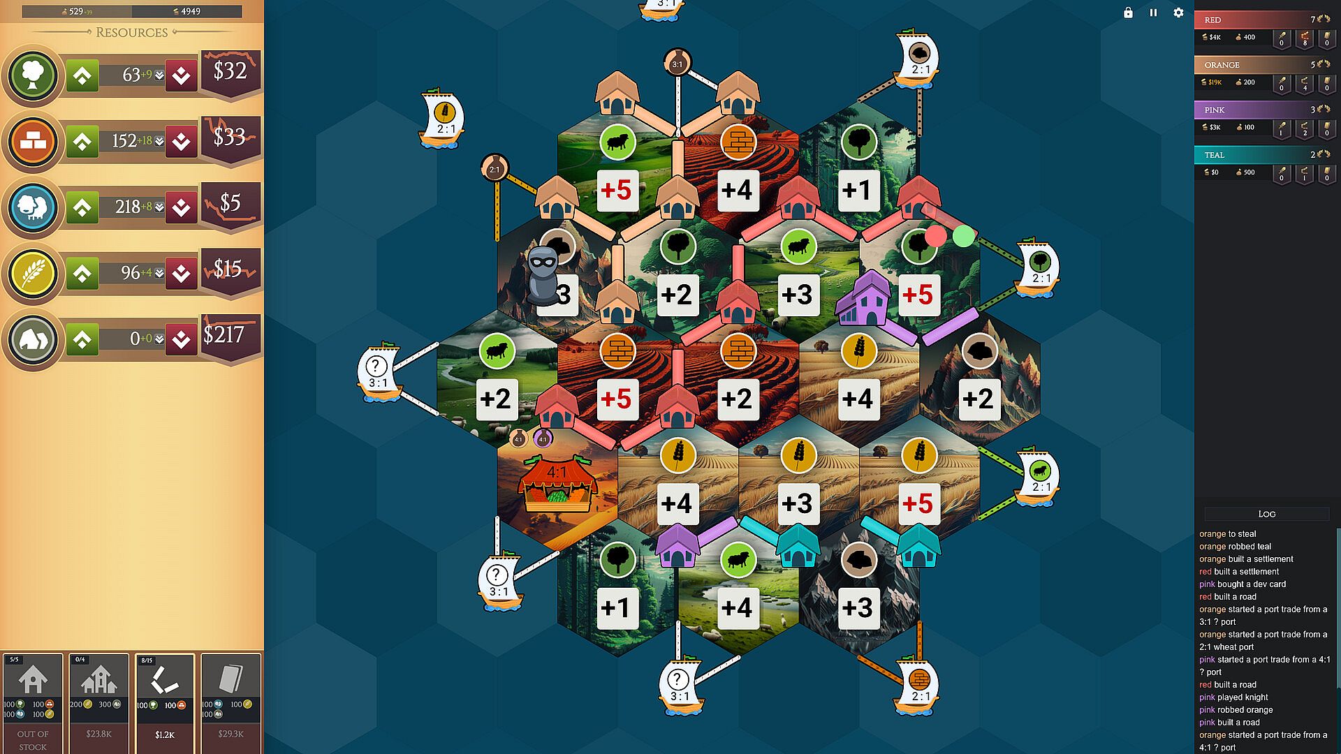 Instead of trading, buy and sell from the same resource market as other players. While prices surge buying in at the right time yields large dividends. Keep market prices high to lock out your opponents or crash them to prevent profits from other players!
