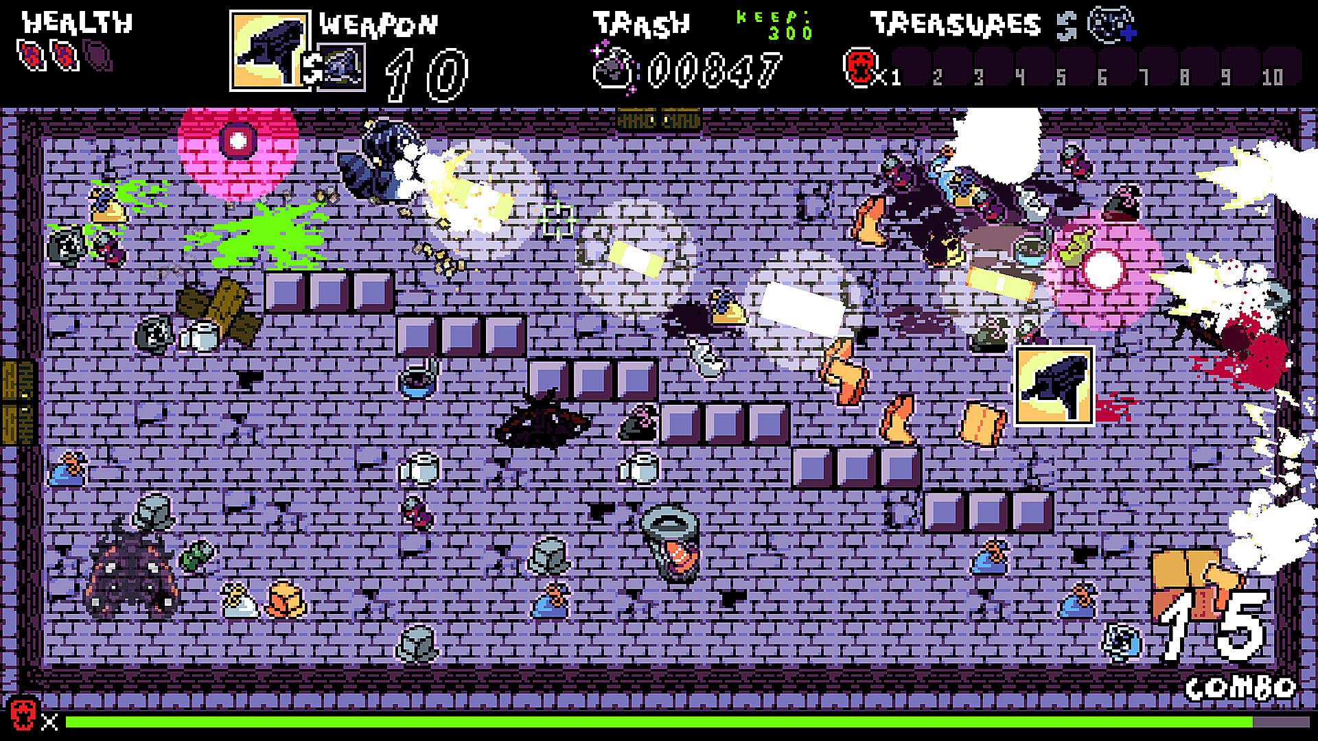 Keep killing enemies and collect trash to rack up your combo. Collect treasures that give you crazy perks, which get stronger the higher your combo gets.