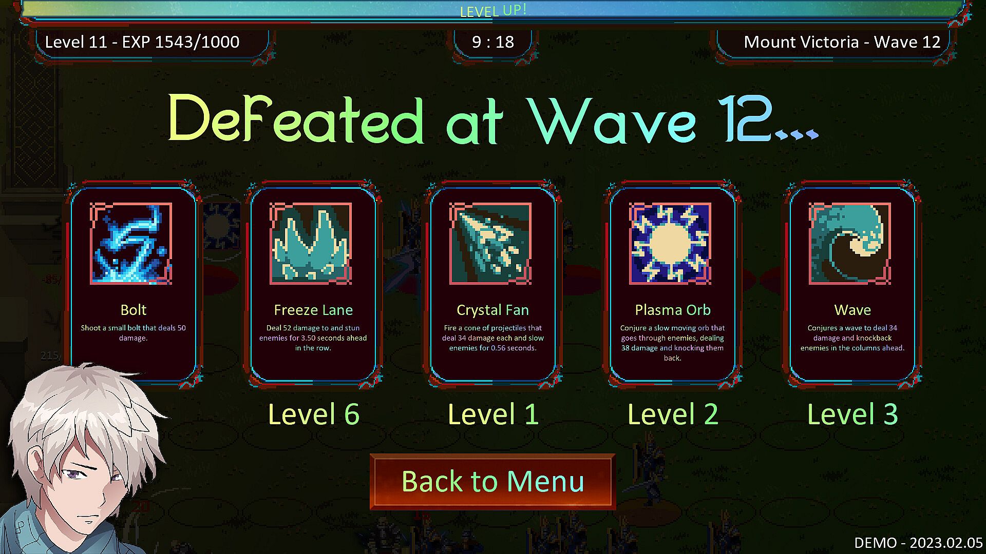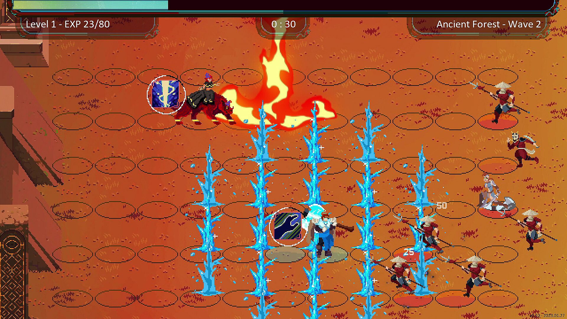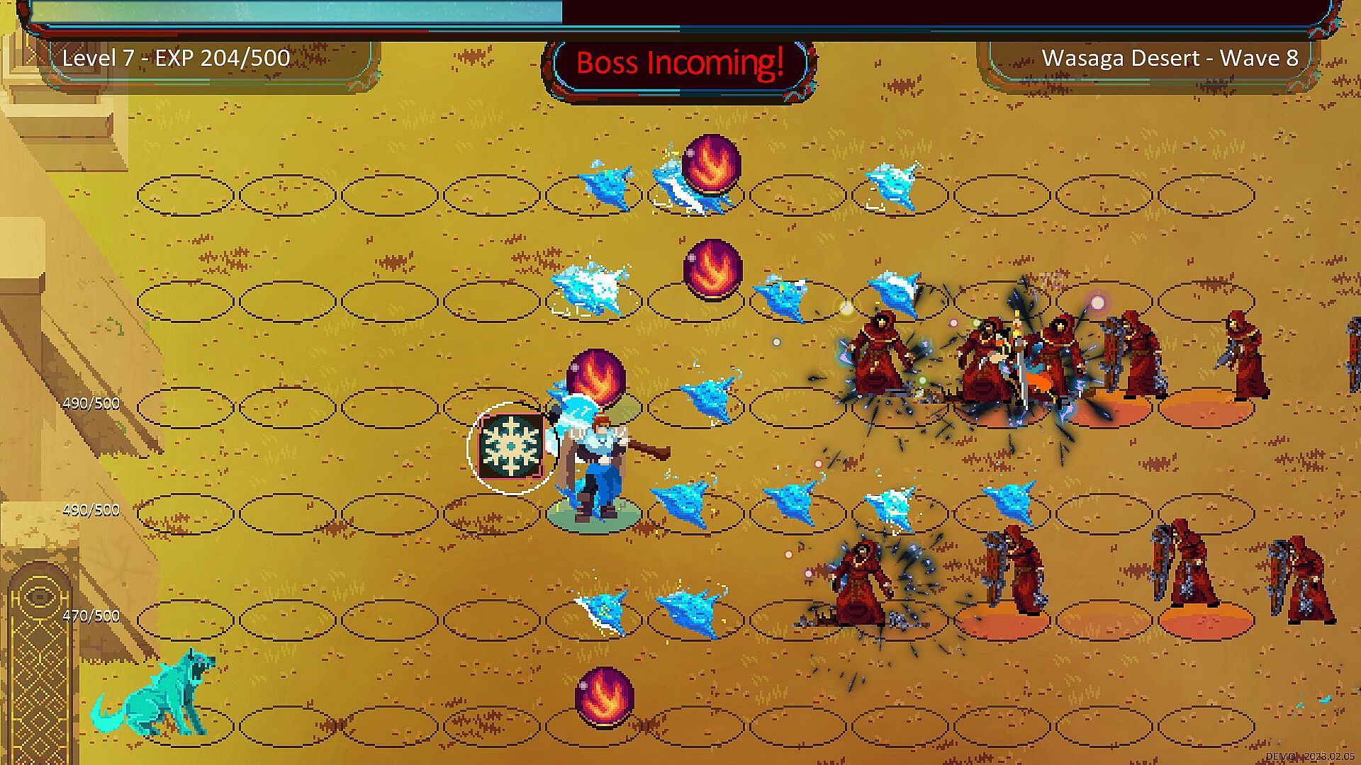 Primarily Inspired by Vampire Survivors and Plants vs Zombies. Automatically attack and cast abilities as you move between lanes defending each from incoming soldiers. At the end of each wave, you will select one of three abilities to assist you. Survive the invasion of the four armies and you win!