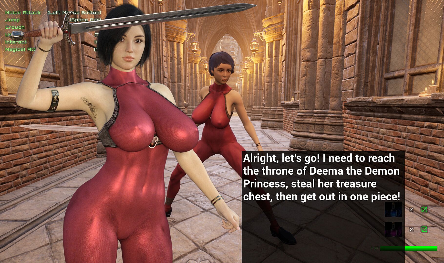 Dana is a strong and beautiful treasure hunter who has recently heard about the Treasure of Deema "The Demon Princess" from the townsfolk. She decided to get her hands on the treasure and started to prepare for her journey.