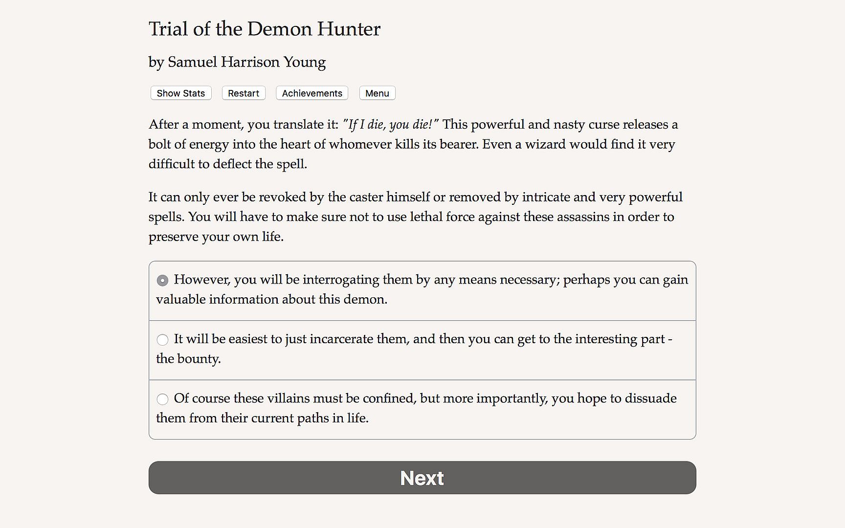 Trial of the Demon Hunter is an epic 85,000 word interactive fantasty novel by Samwise Harry Young, where your choices control the story. It's entirely text-based—without graphics or sound effects—and fueled by the vast, unstoppable power of your imagination.