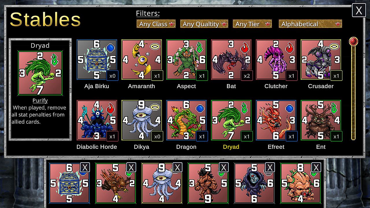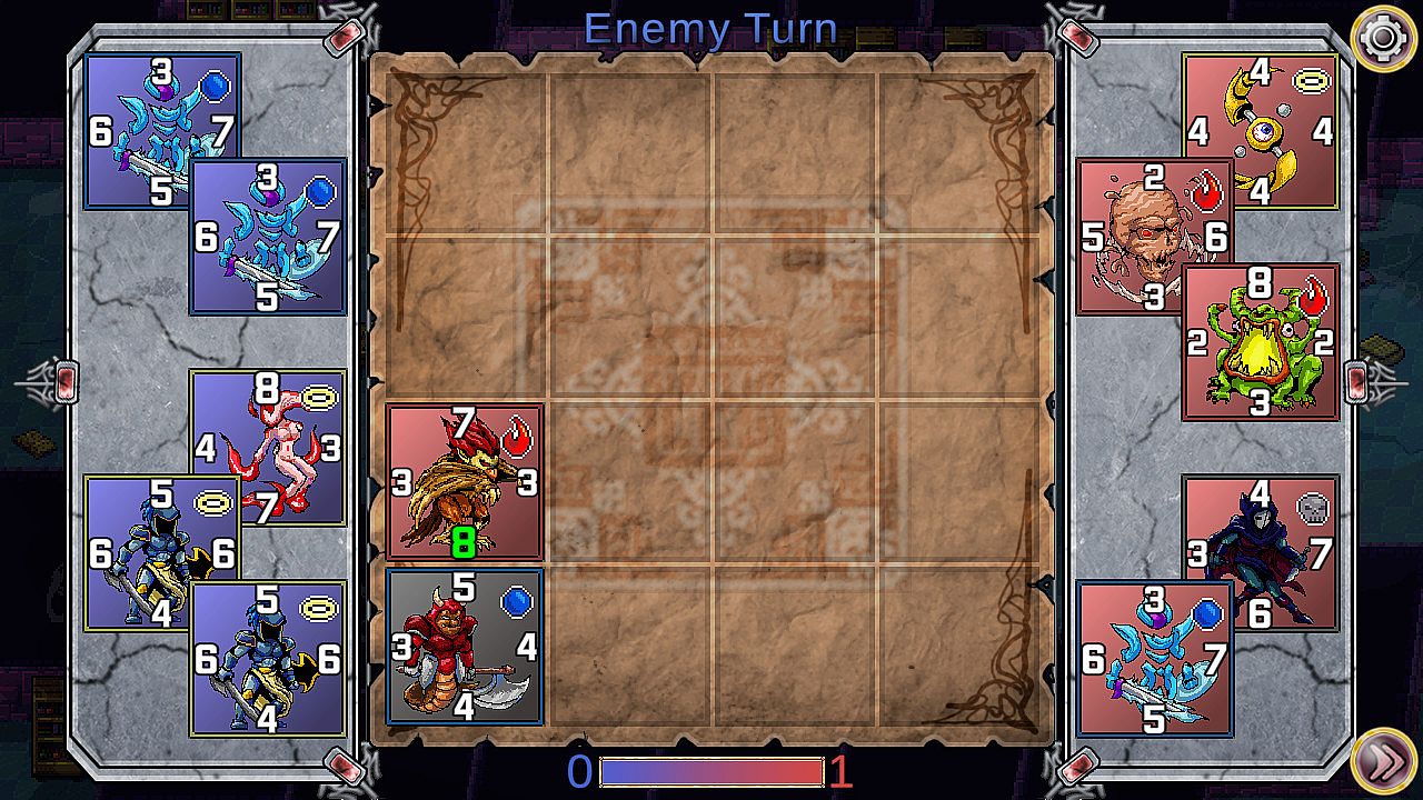 Each card has unique stats and a trait that changes the way they work in battle. Use the Skeleton to snipe your foes from afar, or utilize a kamikaze-style attack with the Apis. The possibilities are endless!